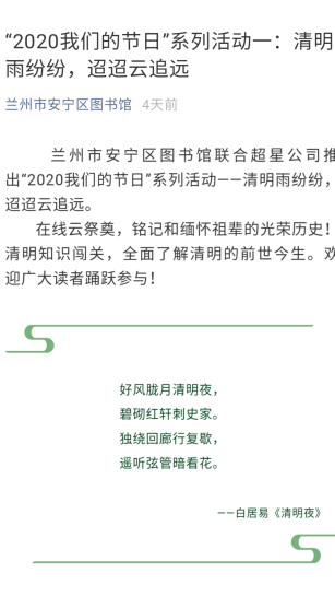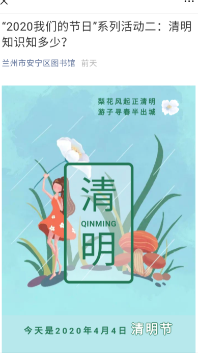“清明”既是自然节气点,也是传统节日。清明祭祖表达着中华民族寻根谒祖的感恩心愿,寄托着人们对已故亲友、革命先辈的追忆哀思,是慎终追远、继志述事、民德归厚的具体体现。在春雨绵绵的清明时节里,安宁区图书馆通过微信平台推出“2020我们的节日·清明”线上系列活动,通过在线云祭奠、以诗寄情致敬英雄、清明知识闯关、清明节有声荐读等活动,让大家了解更多的清明传统文化。