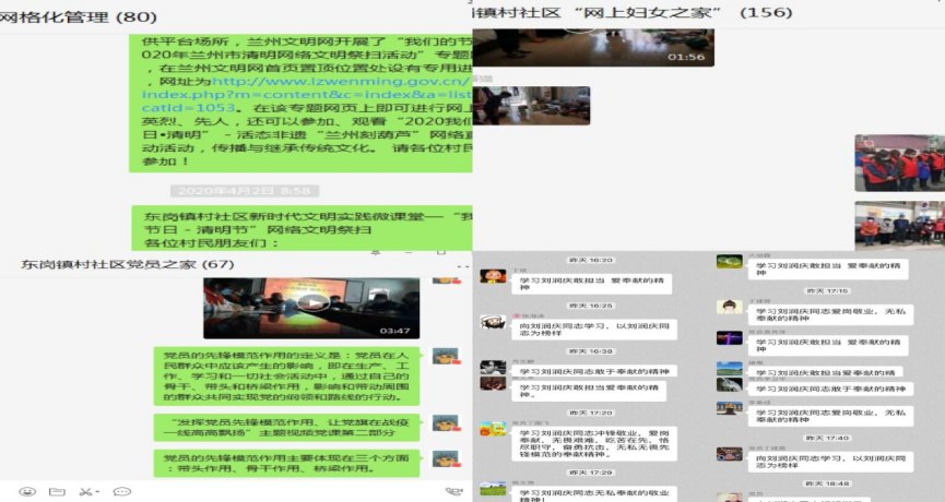 一是打造贴心党员群众互动交流平台。东岗镇村社区党支部搭建党员微信群、辖区村民网格微信群等沟通渠道,建立党员与群众之间及时有效的交流空间,进一步融合党群关系的同时落实党务、居务公开制度。广泛开展宣传,发布村社区工作动态,向辖区居民传递党的声音。为民解忧的同时联络党群感情,通过交流平台凝聚群众智慧,推动村社区和谐发展。