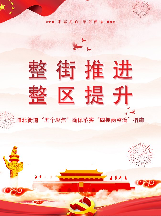 雁北街道“五个聚焦”深入推动“四抓两整治”措施,切实做到“整街推进,整区提升”,通过聚焦队伍建设、阵地建设、组织生活、基础保障及两大整治任务,坚持把全力推进“四抓两整治”作为深化党支部建设标准化,提升基层党建质量活动的有力抓手,进一步凝聚党组织的战斗力、服务力、凝聚力、承载力、组织力,推动辖区各党组织全面进步、全面过硬。