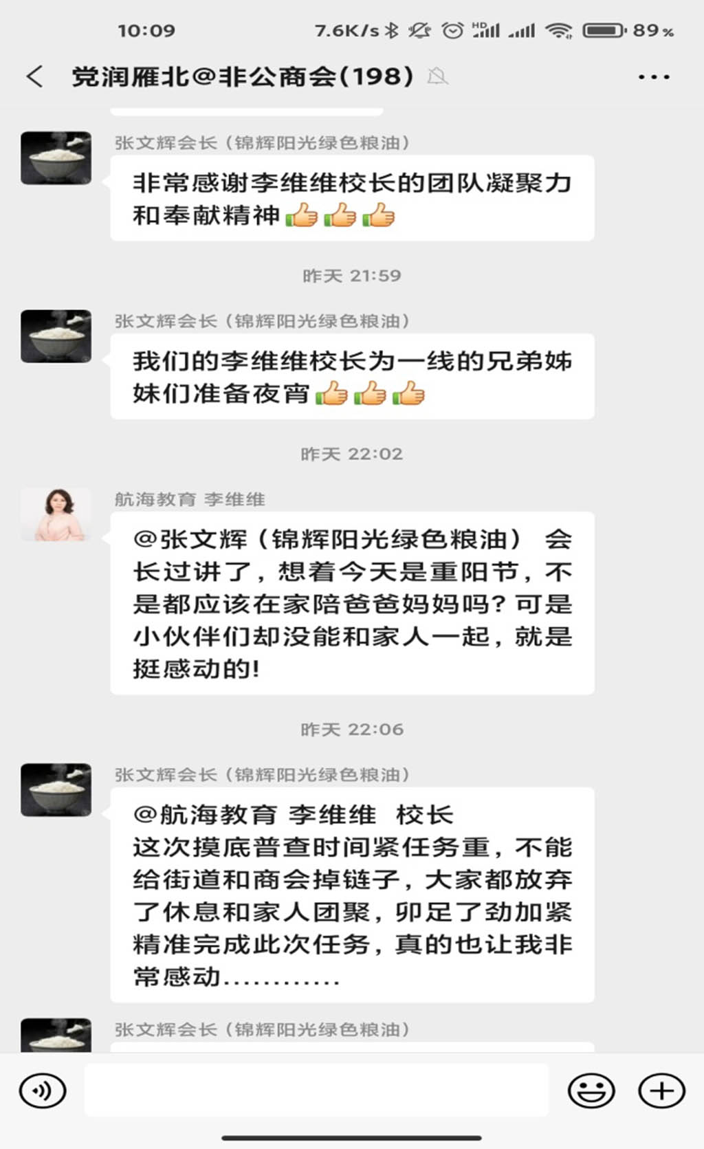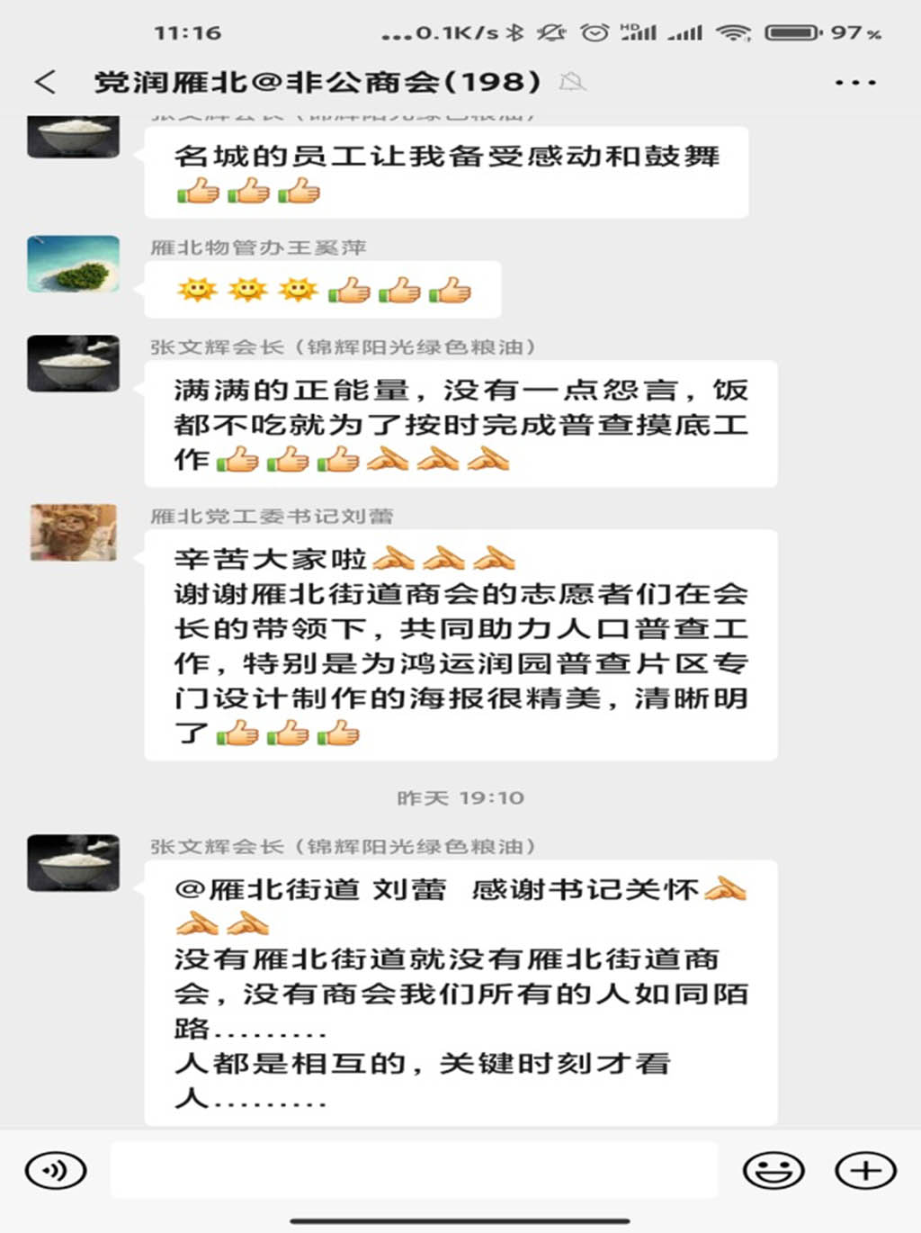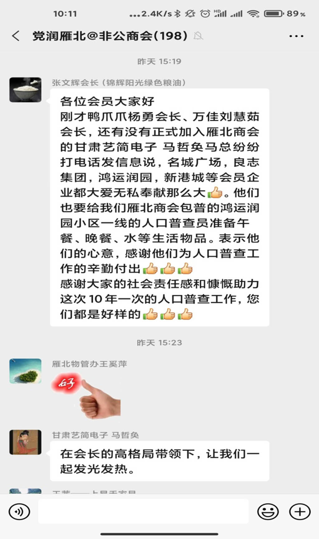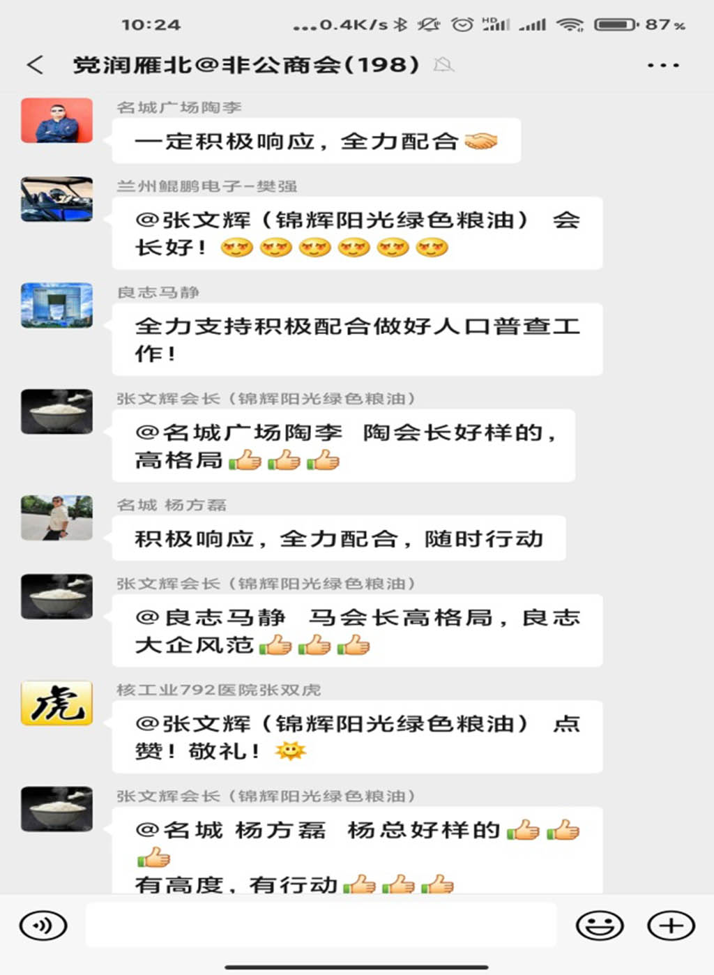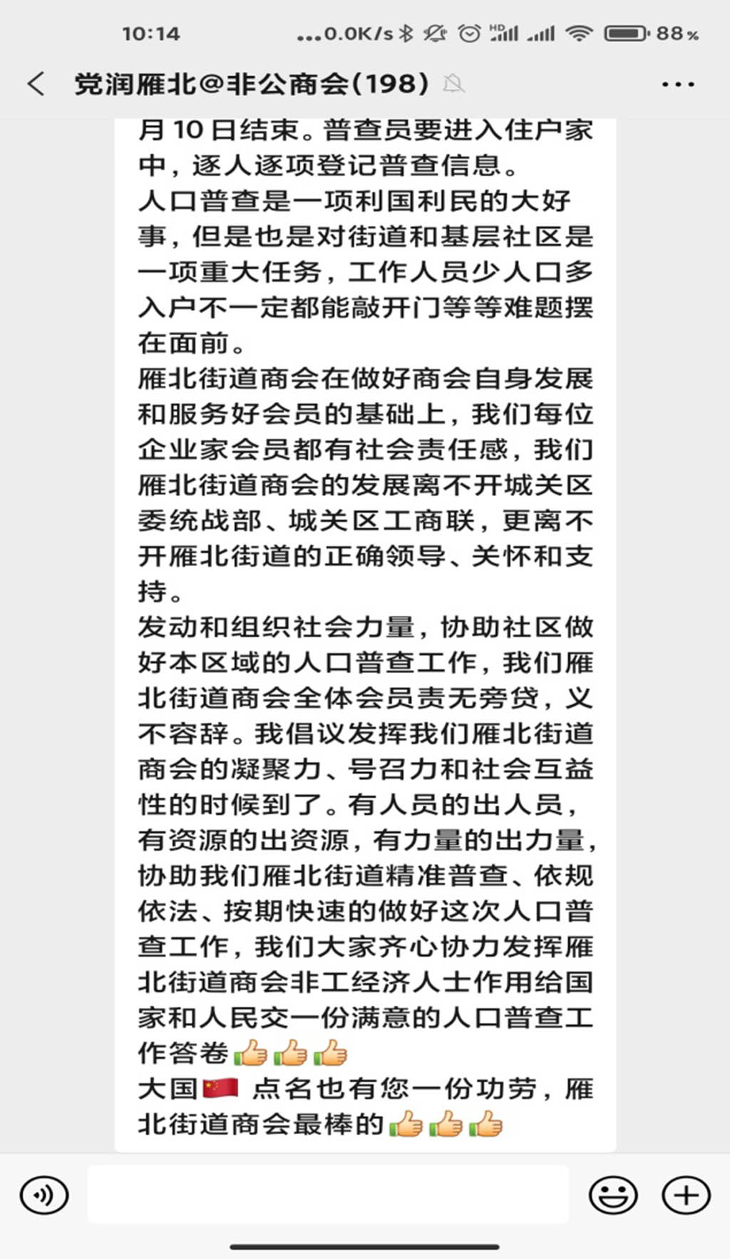 中国甘肃在线城关讯 “大国点名,没你不行……我倡议发挥我们雁北街道商会的凝聚力、号召力和社会互益性的时候到了,有人员的出人员,有资源的出资源,有力量的出力量,协助我们雁北街道精准普查、依法依规、按期快速的做好这次人口普查工作,我们大家齐心协力发挥雁北街道商会非公经济人士作用给国家和人民交一份满意的人口普查工作答卷…”一段质朴暖心、铿锵有力的倡议公告出现在“党润雁北@非公商会”-雁北街道商会群中。由于辖区面积大、人口多,街道人普工作面临着人手不足的问题,雁北街道商会张会长得知街道人普任务时间紧迫、压力较大,积极主动发起倡议,号召商会成员单位发挥人力资源优势,保障街道人普工作顺利完成。
