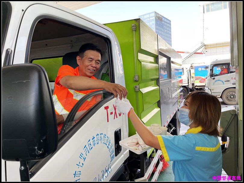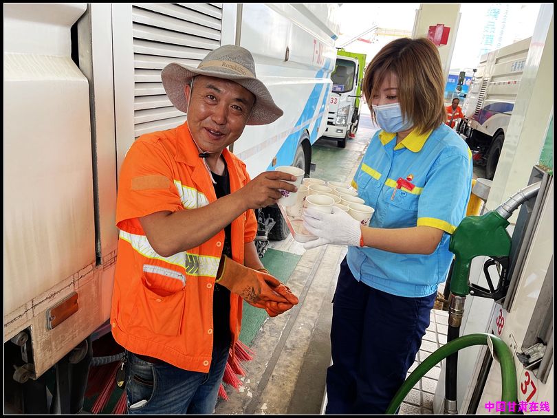 “您好!天气热,喝口绿豆汤解解暑吧!”中国石油甘肃兰州销售分公司玉金加油站经理端着油站自制的绿豆汤,送给前来加油的客户消暑解渴。