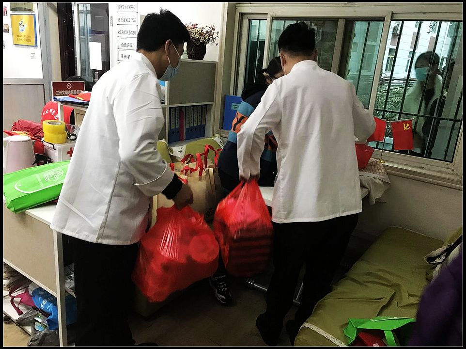 中国甘肃在线兰州讯 兰州市突发新冠疫情,牵动着每个人的心。自19日凌晨开始,社区工作人员、医务人员等持续奋战在一线,连续工作几十个小时,为了保障一线工作人员的安全和饮食,众多爱心企业和个人积极支持安定门社区的疫情防控工作,为安定门社区无偿捐赠防疫物资和食物,点点滴滴的爱心,汇聚成抗疫暖流。
