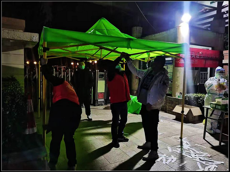 疫情形势严峻,面临此次大考,天庆嘉园社区形成一支“街道领导坐镇、社区书记指挥、工作人员齐上阵”的队伍,督促沿街商铺及辖区单位出入口设置测温卡点。接到扩大核酸检测范围通知后,天庆嘉园社区经过反复勘察,最终确定了核酸检测点位置,并连夜搭建帐篷设置点位,当夜10点开始工作。