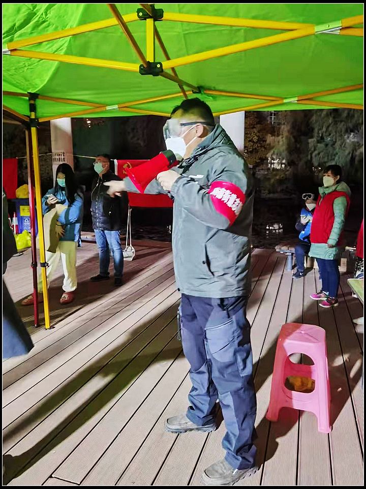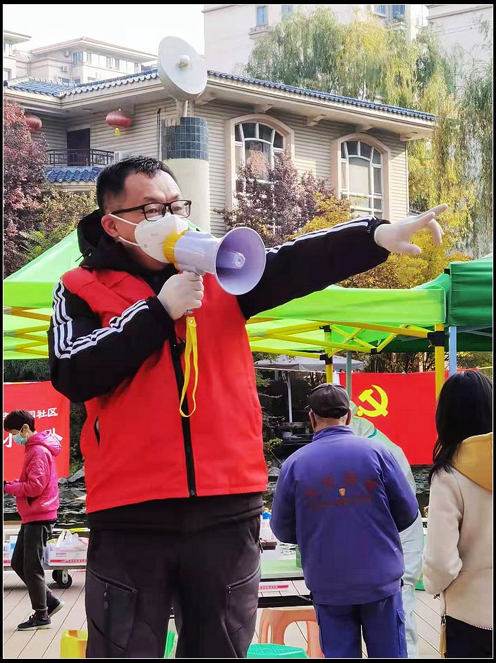 他不仅自己做志愿,还在各个群里发动大家一起为抗击疫情发挥自己的力量,主动承担起志愿者队伍的组织、管理工作。走在居民楼院里拿着喇叭呼叫居民下楼的是他,在核酸检测点呼吁居民提前准备健康码的是他,在各个群里发消息组织后备力量的也是他。在这场疫情抗击战中,他主动担当,擦亮了党员底色,成为天庆嘉园社区党员先锋队的中坚力量,与千千万万的志愿者一起守护着这个城市,等待兰州的城的春暖花开。