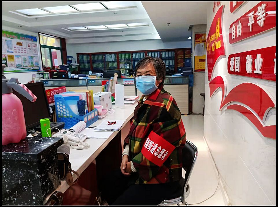 疫情爆发以来,居民形成了大事小事问社区的习惯,天庆嘉园社区电话几乎被打爆了,社区工作人员既要去核酸检测区执勤,又要上报疫情信息、给黄码人员打电话等,一时间人员调配不开。社区书记在党员群里发布寻求志愿的信息之后,一位七十岁的奶奶张亚平第一时间赶到社区,“我去现场维持秩序的话怕体力跟不上,你们去忙你们的,我为社区守好大后方,值班电话我来接,你们只需要告诉我怎么回答就行......”就在这不足三平米的工作台,张奶奶开始了自己的工作。