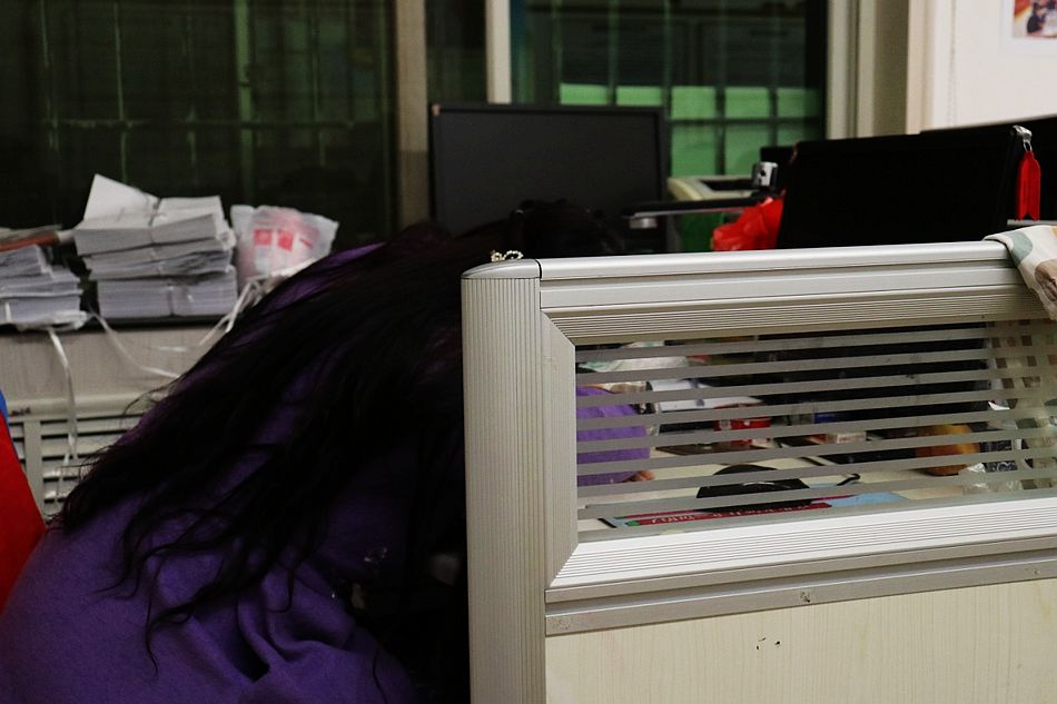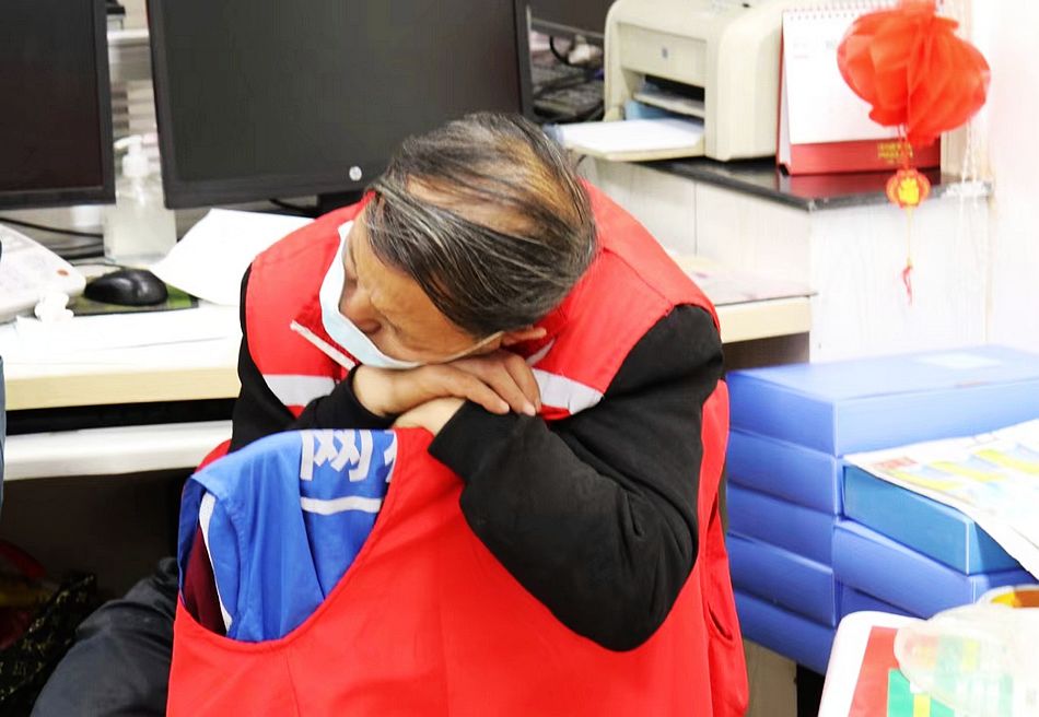 图为社区工作人员在办公桌上简单休息