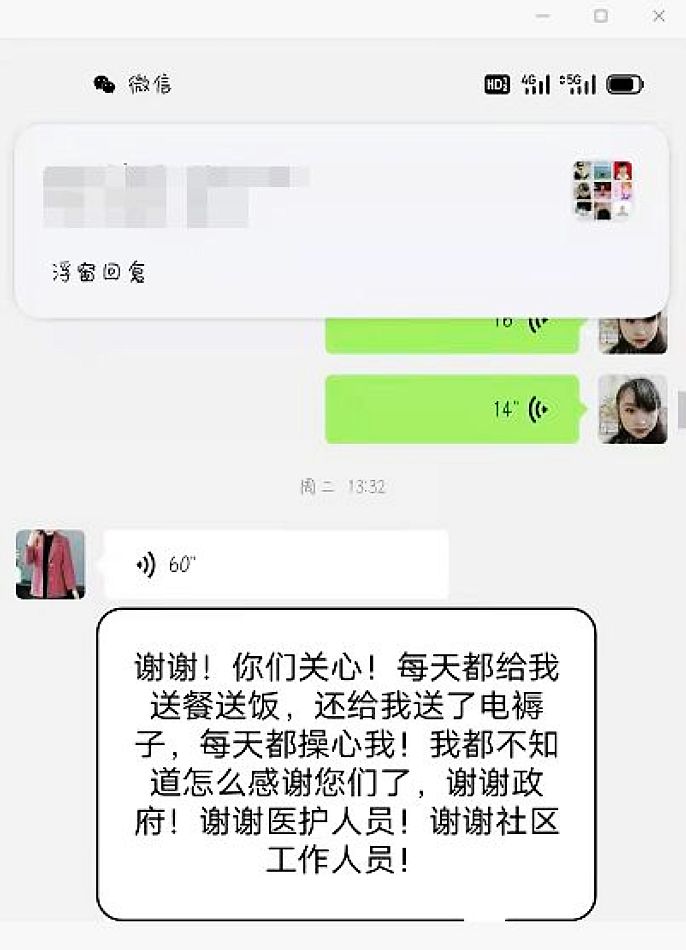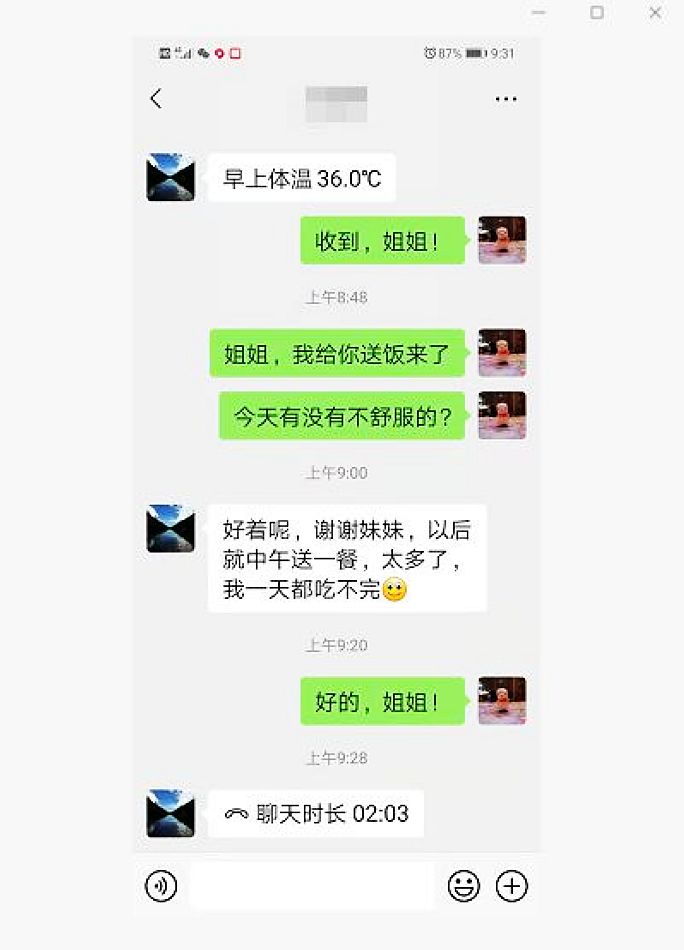 中国甘肃在线兰州讯 “姐姐,欢迎你回来,我是你的专管员,今后7天,你的生活就由我负责,你有什么需要都可以给我说……”;“我的水喝完了,麻烦你给我买一桶,我今天的体温是36.3,正常;晚饭就不麻烦你们送了,我还有其他吃的,谢谢你们关心……”,这是最近居家健康监测人员与社区专管员的聊天记录,看似简单的对话,体现的是隔着屏幕的热情与关怀。隔离病毒,但不能隔离爱,疫情防控,需要力度更需要温度。