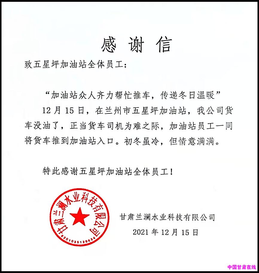 中国甘肃在线兰州讯 2021年12月15日下午,中石油兰州五星坪加油站经理王瑞琼突然收到一封感谢信,原来是甘肃兰澜水业科技有限公司写给五星坪加油站全体员工的感谢信,对该站员工寒冬里合力帮忙将载重货车推到加油站的热心助人行为真诚感谢。感谢信最后说道:“初冬虽冷,但情意满满!特此感谢五星坪加油站全体员工!”
