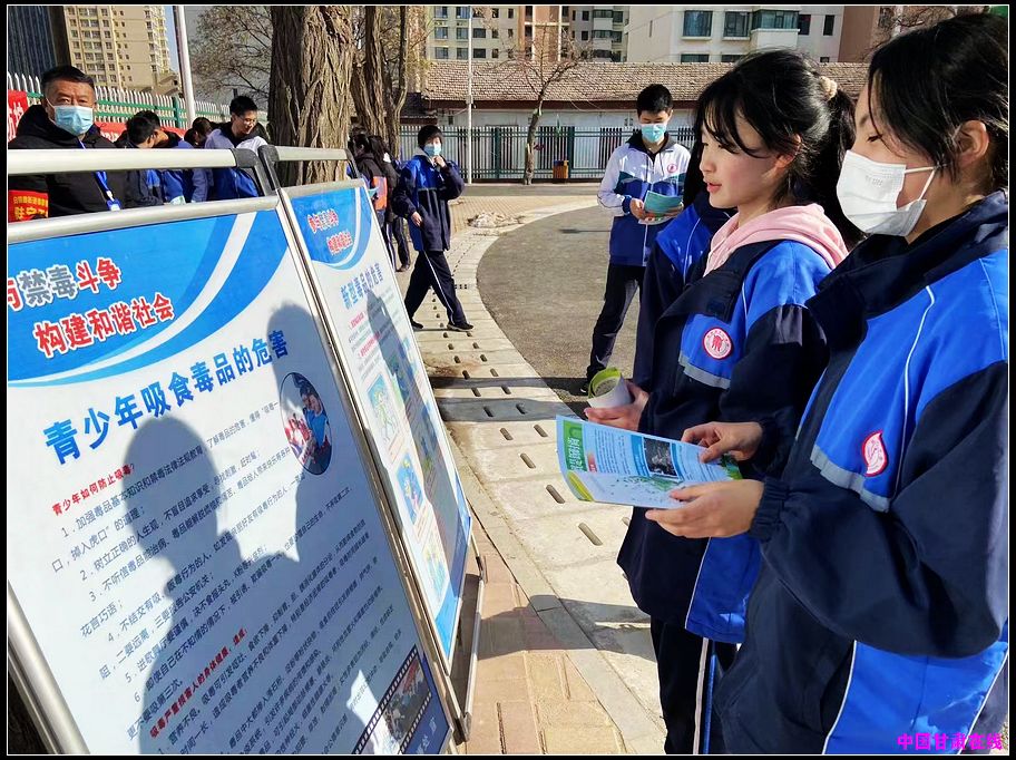 中国甘肃在线兰州讯 开学第一天,为进一步推进青少年毒品预防宣传教育工作,提高青少年识毒、防毒、拒毒意识,营造校园浓厚禁毒氛围。2月22日,-兰州市城关区白银路街道徐家巷社区联合辖区第八中学开展“禁毒我先行,校园无毒品”禁毒宣传活动,通过在八中校园举办禁毒知识讲座,发放禁毒宣传彩页,认识仿真毒品,观看禁毒展板等多种方式,让学生深刻地学习禁毒知识。