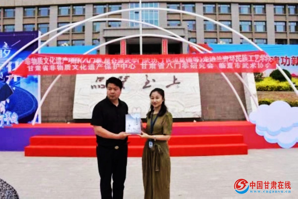 中国甘肃在线讯 月22日, 由甘肃省非物质文化遗产保护中心、甘肃省八门拳研究会、临夏市武术协会组织的非遗武术进校园活动在兰州资源环境职业技术大学举行。甘肃省非物质文化遗产保护中心主任刘卫华,兰州资源环境职业技术大学民族工艺学院院长袁小琰、副院长赵建斌,甘肃省八门拳研究会会长陈永兴,临夏市武协主席马原子,武术非遗传承人丁永喜、张雅蓉、孙刚强、张宁、郝恒阳、鲁文文等参加。