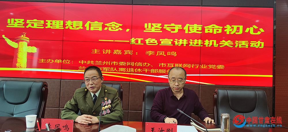 中国甘肃在线兰州讯 3月29日,为深入践行“三抓三促”行动,进一步贯彻党的二十大精神,兰州市军队离退休干部服务站与兰州市委网信办联合开展红色主题宣讲活动,特邀军休干部李凤鸣同志以“我是一名党员:坚定理想信念,坚守使命初心”为主题进行宣讲,宣讲活动采取线上线下同步的方式进行,全市互联网行业党委企业党员、市委网信办机关支部全体党员、市军休站部分领导干部等120余人参加活动。