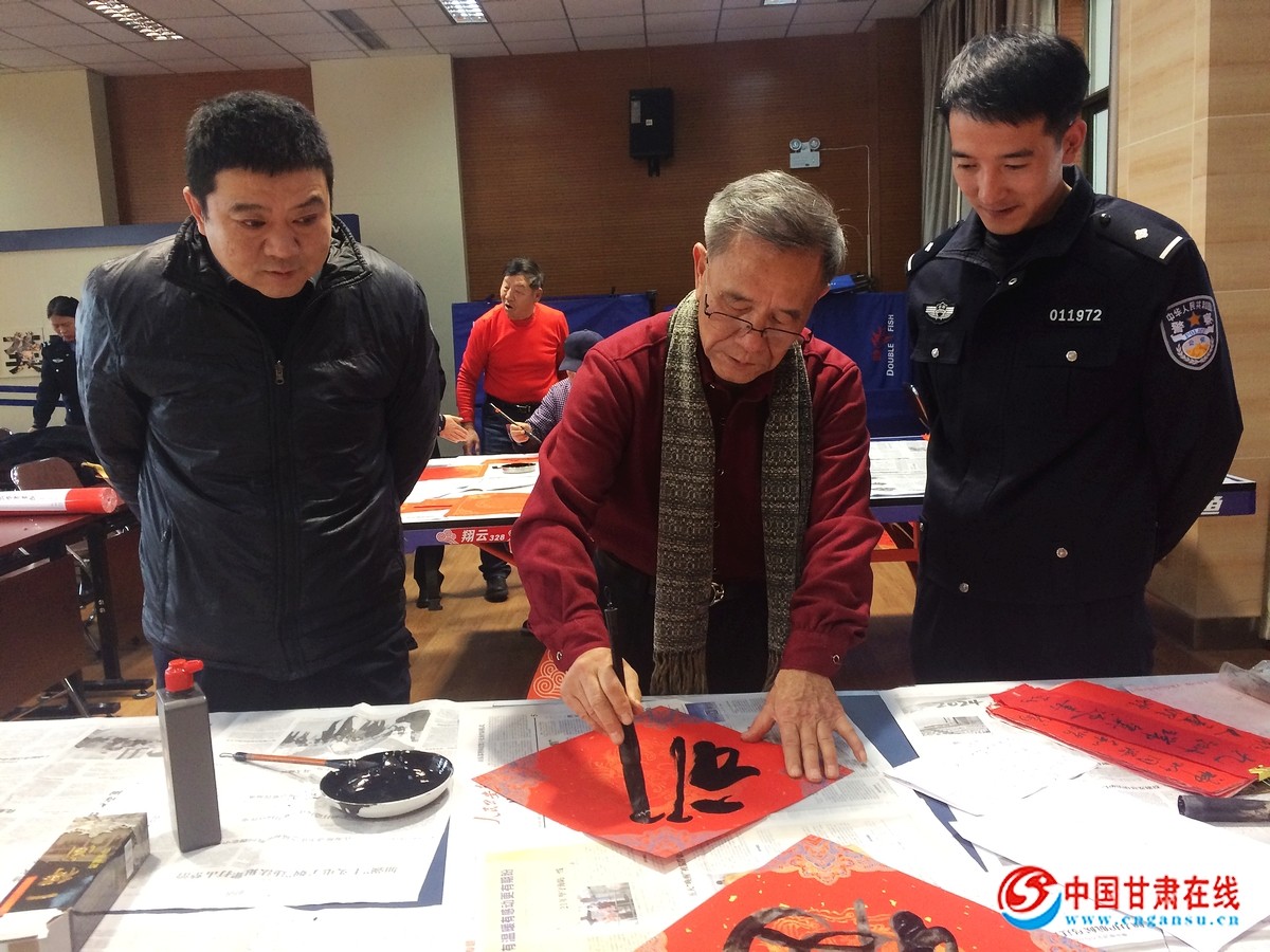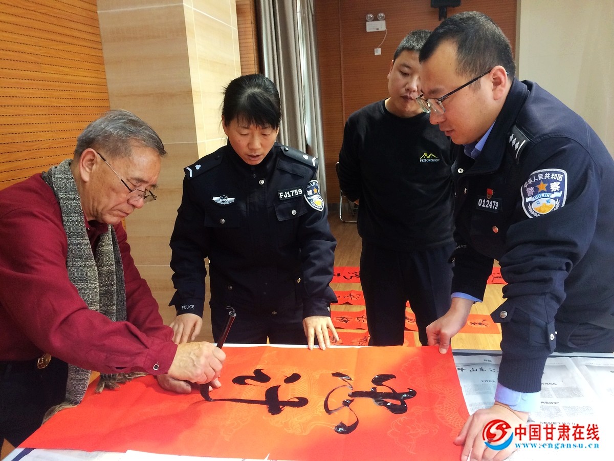 这天一大早,书法家李明慧、汪鸿、田成等一行4人,应邀来到兰州市公安局交通警察支队龚家湾大队,为常年坚守交通一线、确保一方安全、守护万家平安的大队民辅警书写迎春对联、贺岁福字,提前向广大民辅警们及其家属贺岁拜年,表达对人民“安全卫士”的由衷感谢、感恩之情。