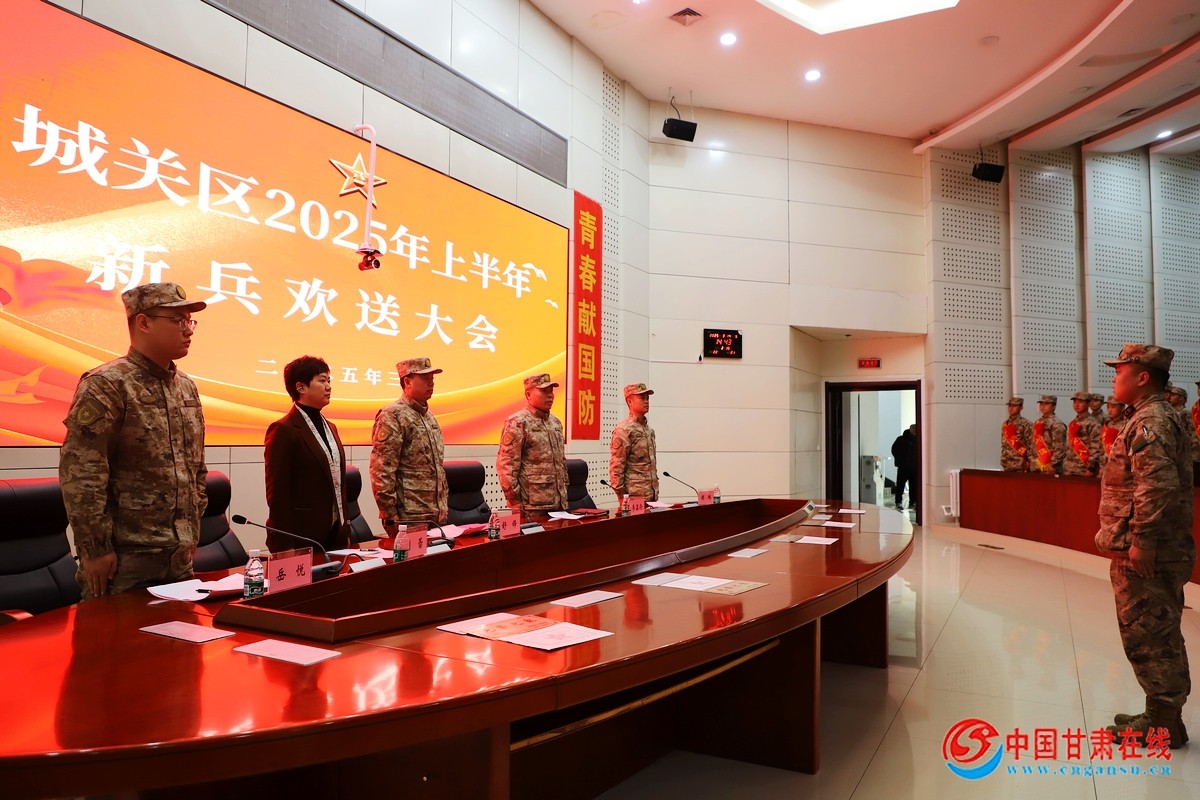 中国甘肃在线兰州讯 3月14日,兰州市城关区2025年上半年新兵入伍欢送大会在役前教育基地举行。区人武部领导、区退役军人事务局局长和相关部门负责人、全体新兵、新兵家长代表及带训骨干共170人出席活动。