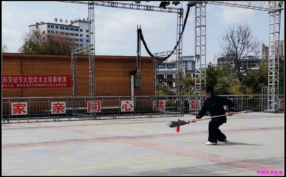 为进一步进丰富干部职工及群众五一期间的文化生活,由该县总工会主办,太极拳康乐研究会、康乐云龙文化传播有限公司工会承办了这次大型武术太极拳表演活动。节目有集体太极拳、大刀队、集体剑术,以及太极拳炮锤、太极单刀、太极剑、太极扇、太极功夫笔、棍术等,一个个精彩绝伦的武术表演,不时赢得阵阵喝彩声,将活动推向了高潮。(马晓春)