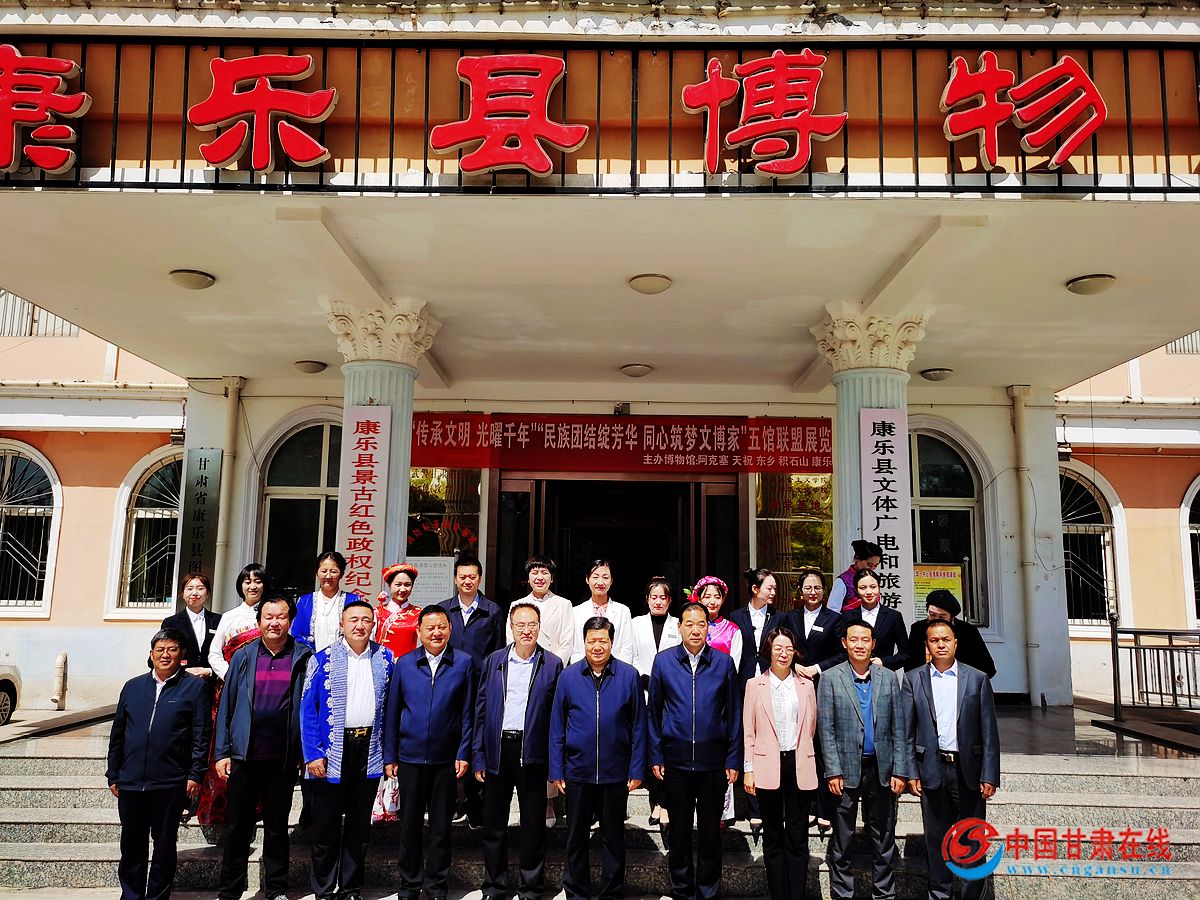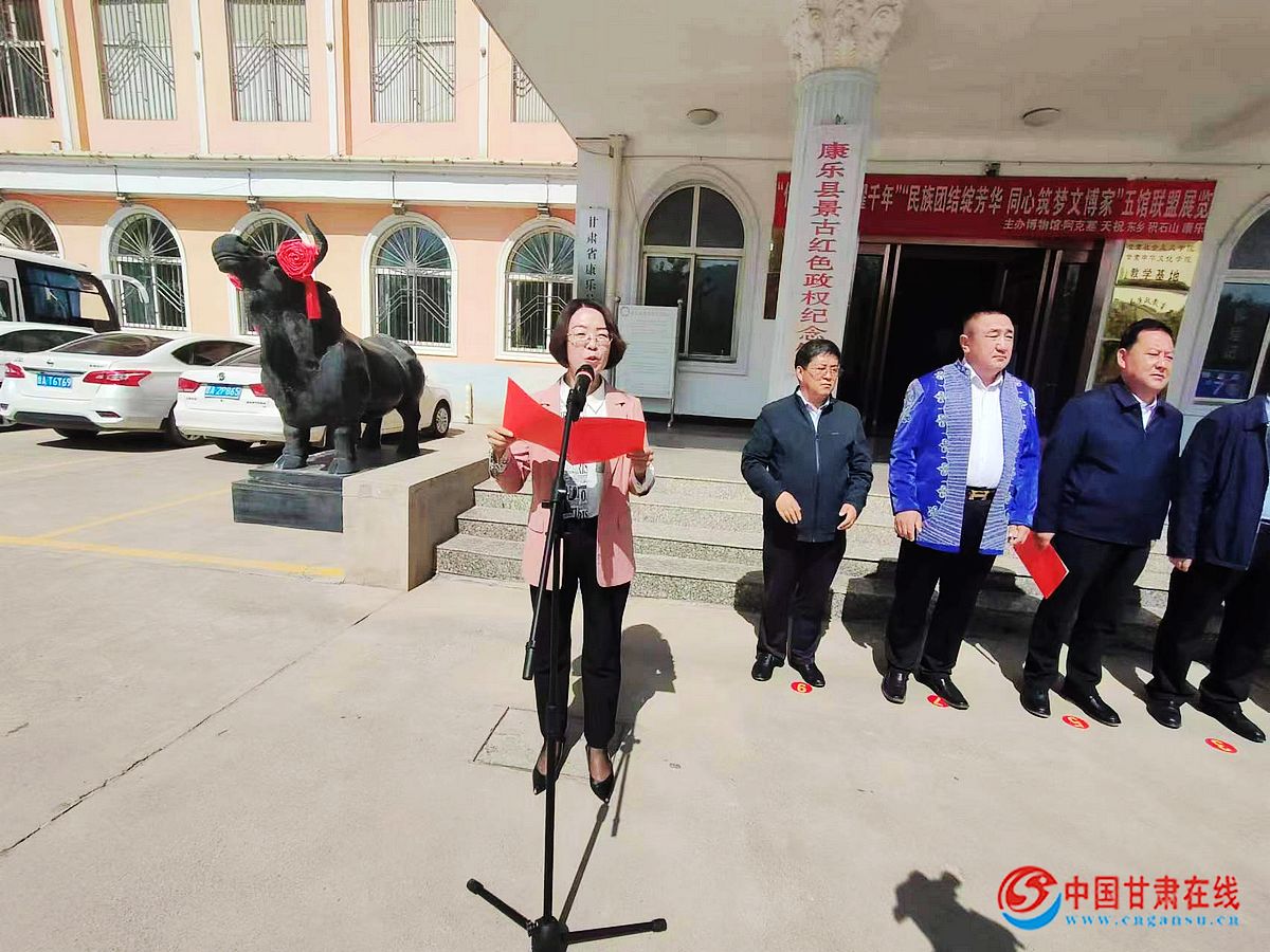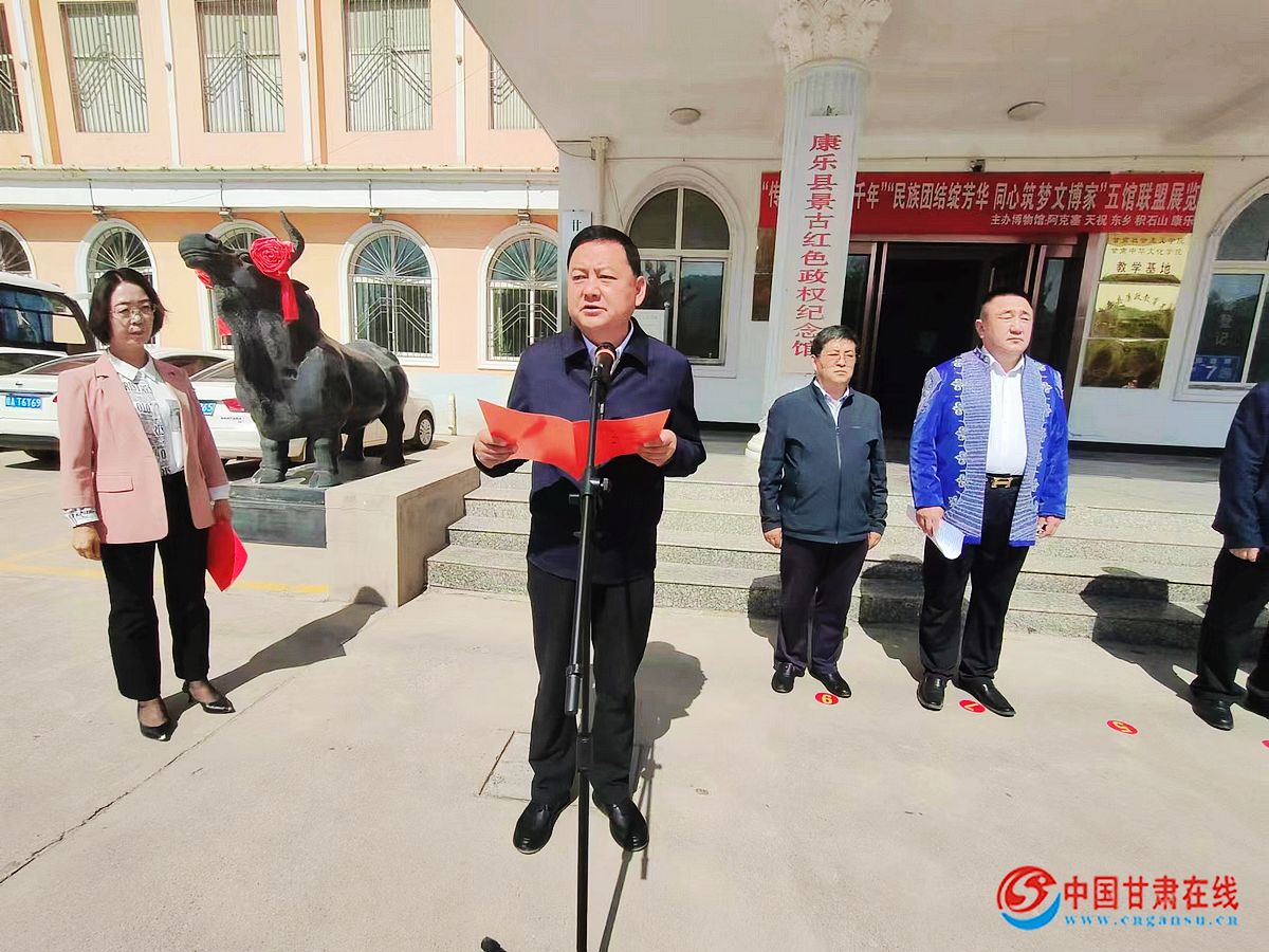 中国甘肃在线康乐讯 5月17日,临夏州康乐县在博物馆举行以“传承文明•光曜千年”新捐赠文物展厅暨“民族团结绽芳华•同心筑梦文博家”——“披在身上的民族文化”五馆联盟临时展厅开展仪式。县人大常委会主任马雪青、县政协主席虎文正、州委统战部二级调研员王云、县委副书记马珺、县人大常委会副主任马烨晟、县政协副主席杜春福,兄弟县博物馆负责人、县委办、政府办、人大办、政协办以及捐赠企业、宗教界、社会热心人士代表、县直相关部门干部职工参加仪式。副县长杜翠芳主持仪式。