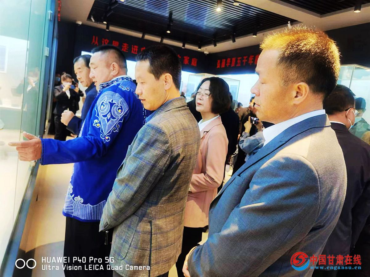 仪式结束后,参观新布置的“传承文明 光曜千年”展厅。该展厅共展出康乐县社会各界热心人士近期捐赠的彩陶、玉器、瓷器、青铜器、古化石、红色文物等1769件。分为三个展区,分别为以“弘扬华夏五千年的优秀传统文化,构筑中华民族共有精神家园”为主题的彩陶及瓷器展柜;以“文化认同是最深层次的认同,是民族团结之根、民族和睦之魂”为主题的瓷器铜器展柜;以“品悟中华文化,传承民族精神”为主题的化石展柜。