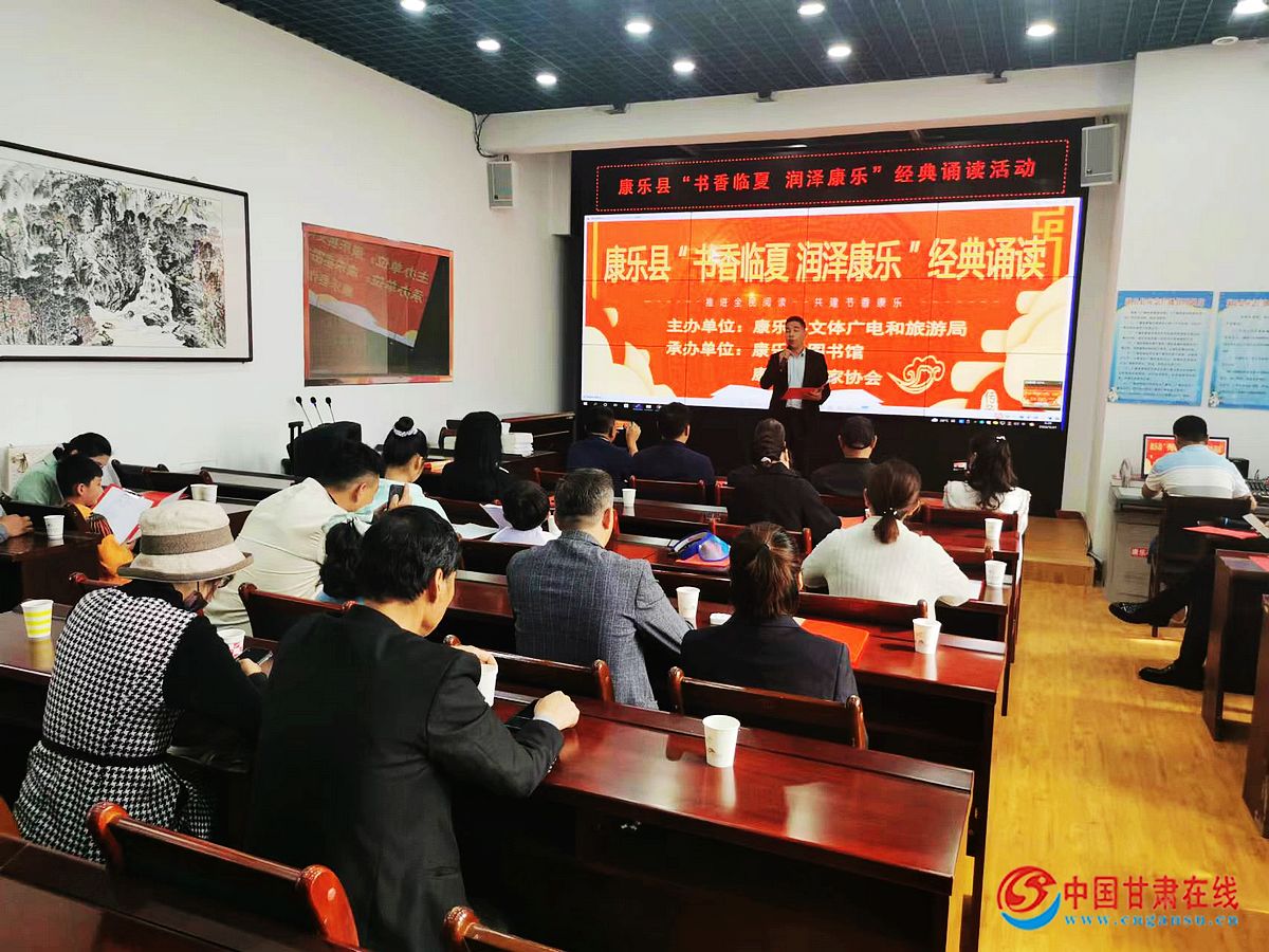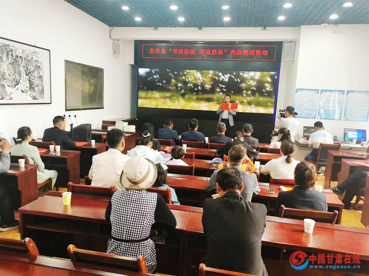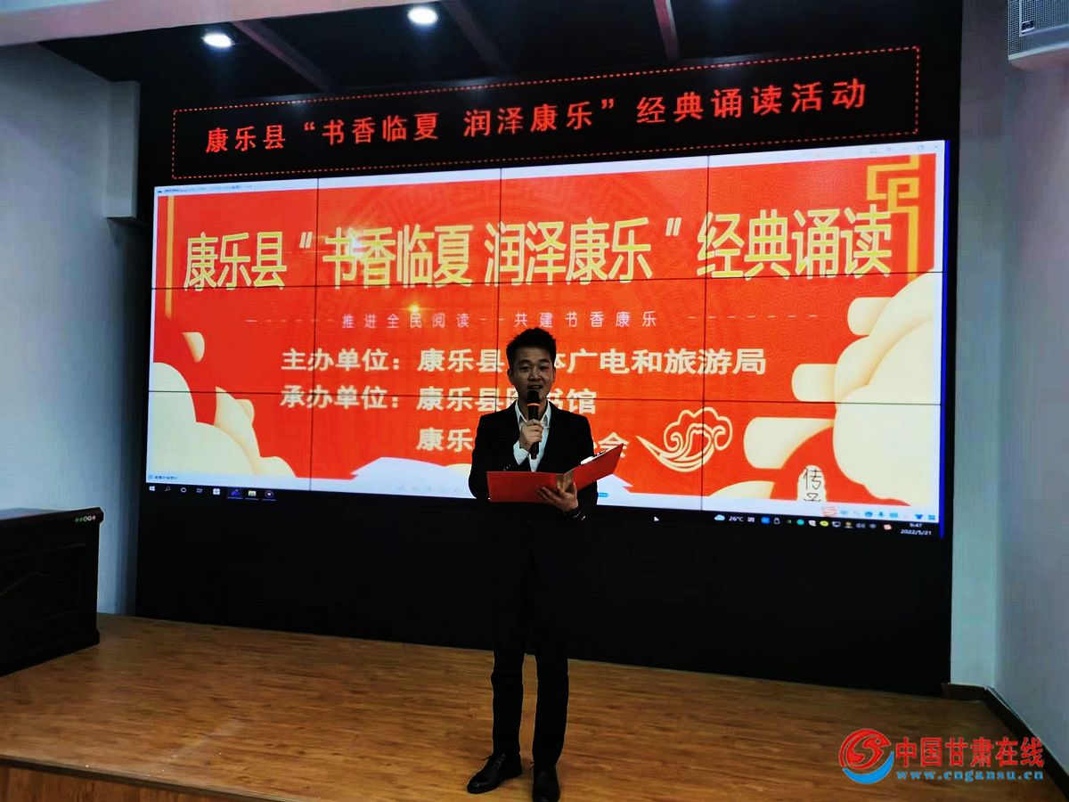 中国甘肃在线康乐讯 为展示新时代“花儿故乡·生态康乐”文化旅游品牌新形象、着力打造“书香临夏·润泽康乐”品牌,讲述民族团结好故事,讴歌幸福美好新康乐,在全社会大力营造爱读书、读好书、善读书的社会风尚,2022年5月21日,临夏州康乐县举行“书香临夏·润泽康乐”经典诵读活动,县文联三级调研员、县作家协会主席马晓春,县文旅局副局长周安辉,县图书馆馆长范军,11名参赛选手和全县文艺爱好者60余人聆听了朗诵。