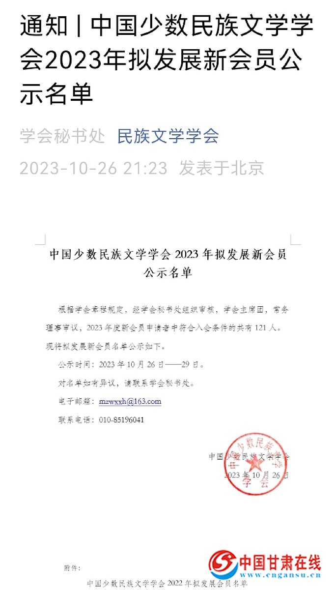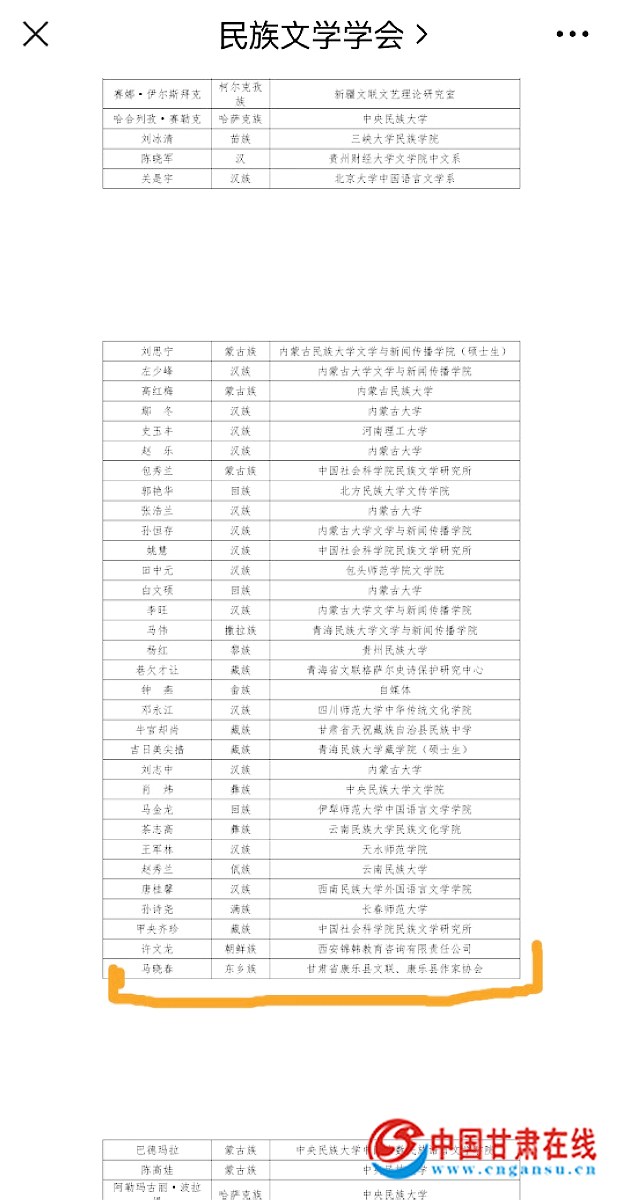 中国甘肃在线康乐讯 近日,中国少数民族文学学会网公布了2022年发展的新会员公示名单,康乐县作协主席马晓春榜上有名,他是中国少数民族文学学会吸收的临夏籍唯一会员。