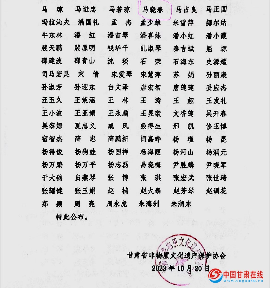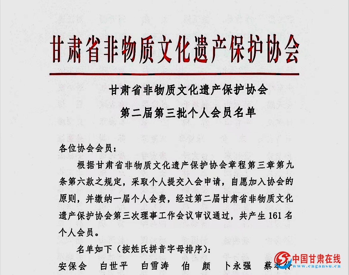 中国甘肃在线康乐讯 初冬时节,从甘肃省非物质文化遗产保护协会传来喜讯:经过第二届甘肃省非物质文化遗产保护协会第三次理事工作会议审议通过,吸收康乐县马晓春等一批莲花山花儿研究者传承人为会员。