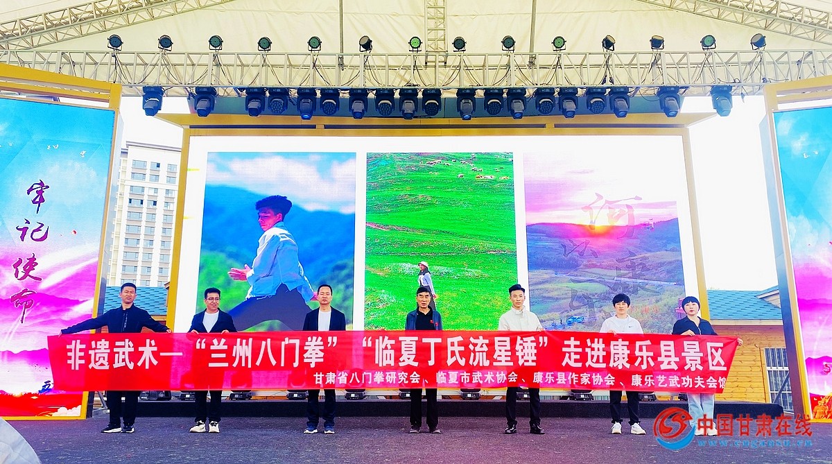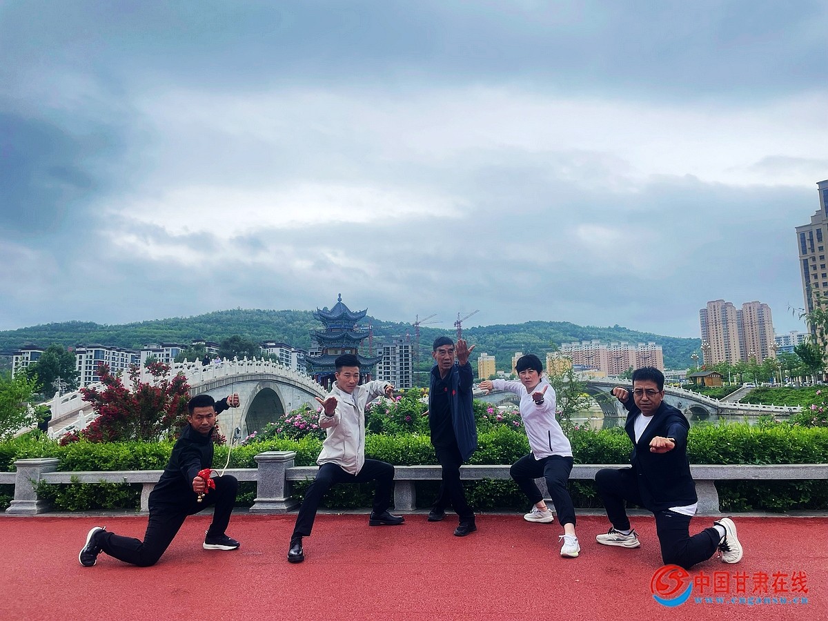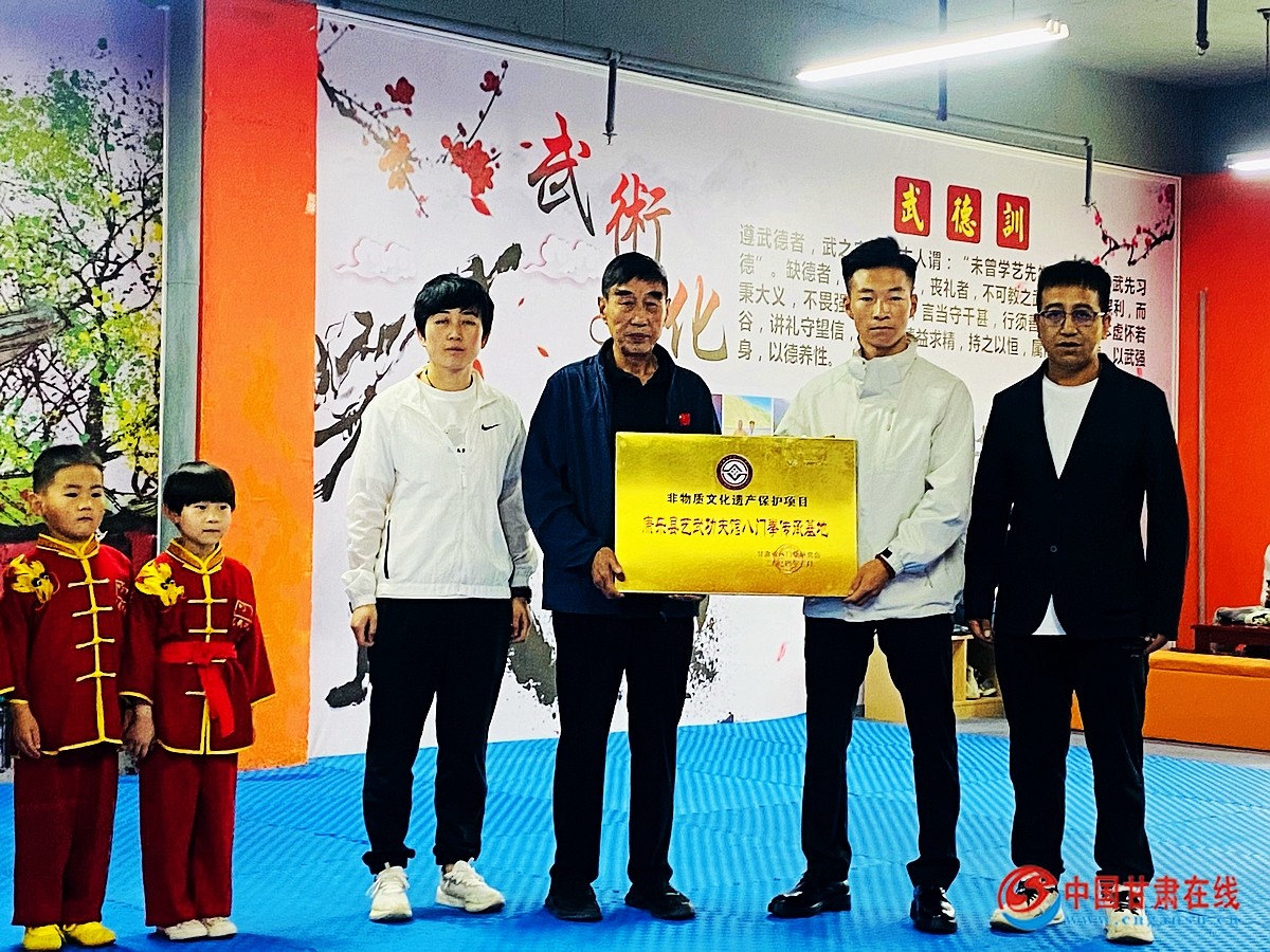 中国甘肃在线临夏讯 六月的康乐,花红柳绿,宛如画卷。5月28日,甘肃省八门拳研究会在康乐艺武功夫会馆举行“非物质文化遗产保护项目八门拳传承基地”授牌仪式。甘肃省八门拳研究会会长陈永兴、办公室主任张雅蓉、宣教部部长张宁,临夏市武术协会常务副主席、临夏丁氏流星锤代表性第四代传承人丁永喜,康乐艺武功夫会馆教练及学员参加。
