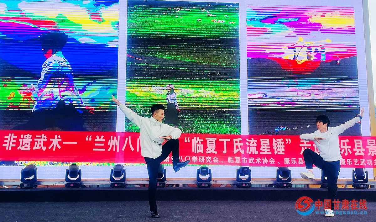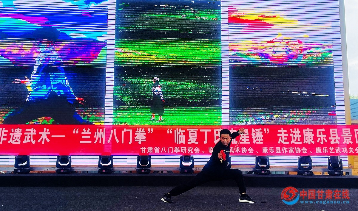 授牌仪式上,康乐艺武功夫会馆小学员们以绝妙的身法和招式,将中国武术的博大精深展现得淋漓尽致,令人叹为观止。张雅蓉、丁永喜老师表演了虎虎生威、精彩绝伦的八门拳和丁氏流星锤。之后,由甘肃省八门拳研究会主办,临夏市武术协会、康乐县作家协会协办,康乐艺武功夫会馆承办的非遗武术——“兰州八门拳”“临夏丁氏流星锤”走进康乐县胭脂湖景区。在百姓大舞台上,表演了绝妙的武术,动作刚猛有力,如猛虎下山;打出的拳,有时如闪电划过长空,有时如白云流泻,变化多端,让人眼花缭乱。陈永兴、张雅蓉、张宁、丁永喜、郭正军老师在胭脂湖前表演了精彩绝伦的武术,他们精神抖擞,步伐矫健,动作刚柔相济、张驰自如,真是美不胜收;他们身手敏捷,动作矫健,挥流星锤,真是精彩极了,不时引来游客围观。(马晓春)