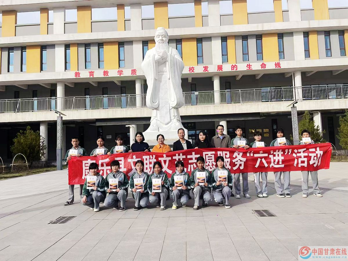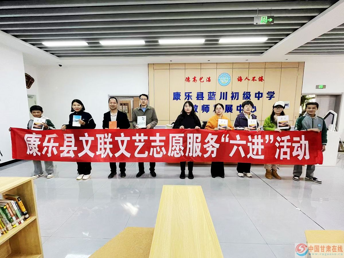 中国甘肃在线康乐讯 阳春三月,惠风和畅,书香满园。2026年4月1日,由康乐县文学艺术界联合会、康乐县作家协会联合开展的文艺志愿服务“六进”活动,在蓝川初级中学正式举行。县文联主席张璐,县文联三级调研员、县作家协会主席马晓春,县作协副秘书长鲍燕,县作协会员、青葵文学社社长侯杏桃,以及学校图书馆负责人、青葵文学社全体成员与学生代表共同参与此次活动,在校园里掀起了一股浓郁的文学热潮。