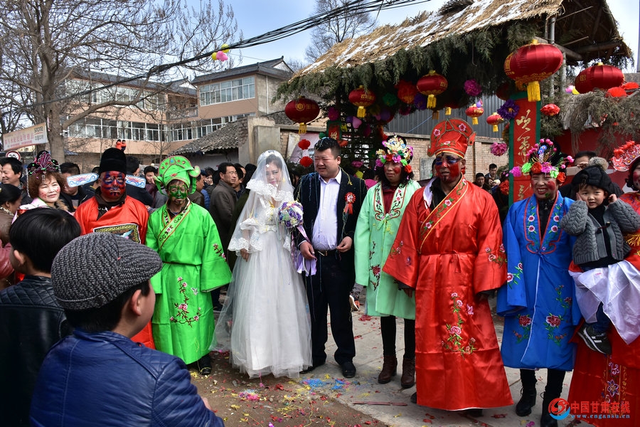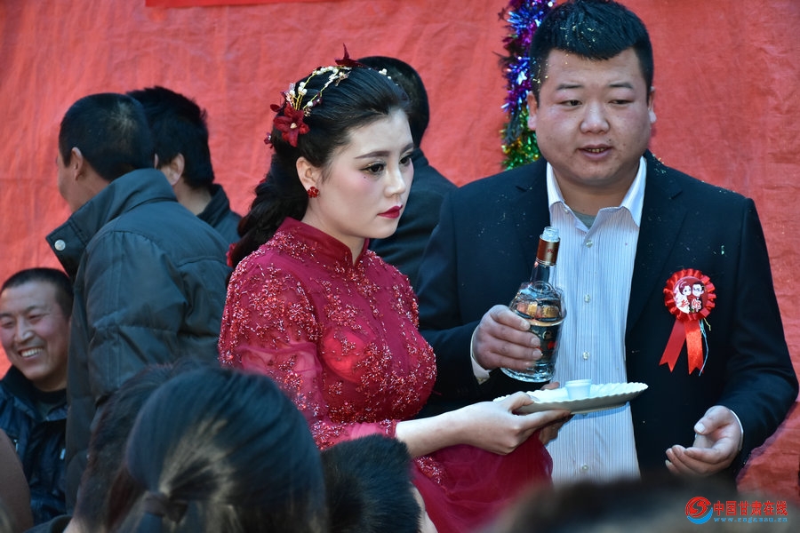 按照当地习俗,赵新忠先生的弟弟和弟媳全部化装出场。临近中午时分,随一串清脆的鞭炮声,新郎赵起、新娘赵宁走下了婚车,在伙伴们的欢叫声中款款步入婚宴大厅。在接受亲朋的祝福后,逐桌为来宾敬酒。新郎英俊潇洒,新娘美丽大方。公公赵新忠和婆婆赵月兰乐得嘴都合不上,婚礼高朋满座,热闹非常。