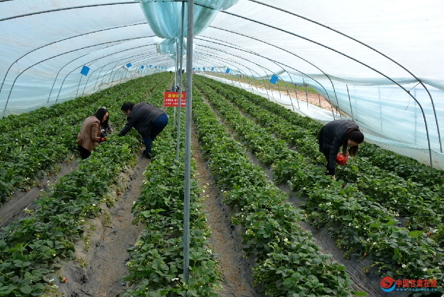 4142号图片消息:阳春三月,几位市民在礼县城关镇石岭村草莓园采摘草莓。礼县抢抓精准脱贫机遇,出台“一扶一带”奖补政策,不断加大特色产业培育,带动就业,促进农户收入。