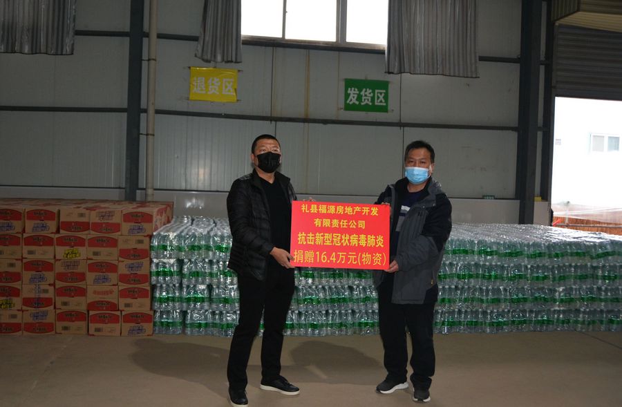 2月5日,礼县福源房地产开发有限责任公司,通过礼县红十字会向抗击在疫情一线的工作人员,捐赠了价值16.4万元的防疫物资,由爱心企业直接送到县疫情联防联控小组办公室、联防联控宣传组、礼县高速路口、县融媒体中心、盐官镇、雷坝镇、城关镇及土山村委会等疫情防控一线监测站点,这一举动充分体现了民营企业家的社会责任感。