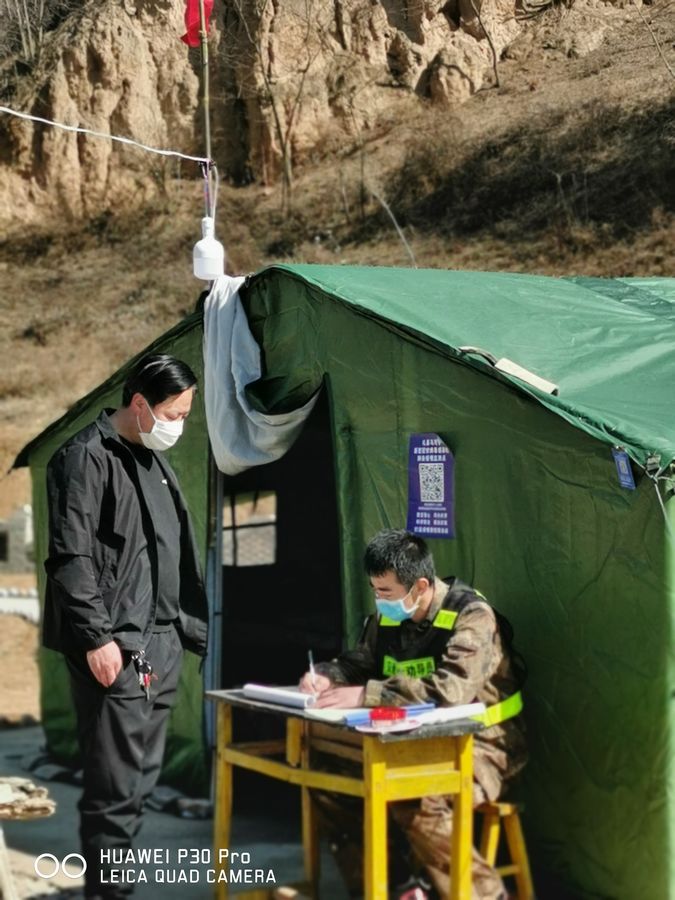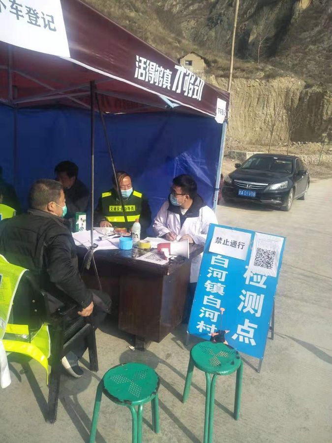 冬日的礼县白河镇石冲村疫情防控监测点,处于白河水和铨水河的交界处,哪里寒风刺骨,可该村的志愿者何疆,在登记本上认真地记录着每一位过往行人的体温结果和车辆信息。