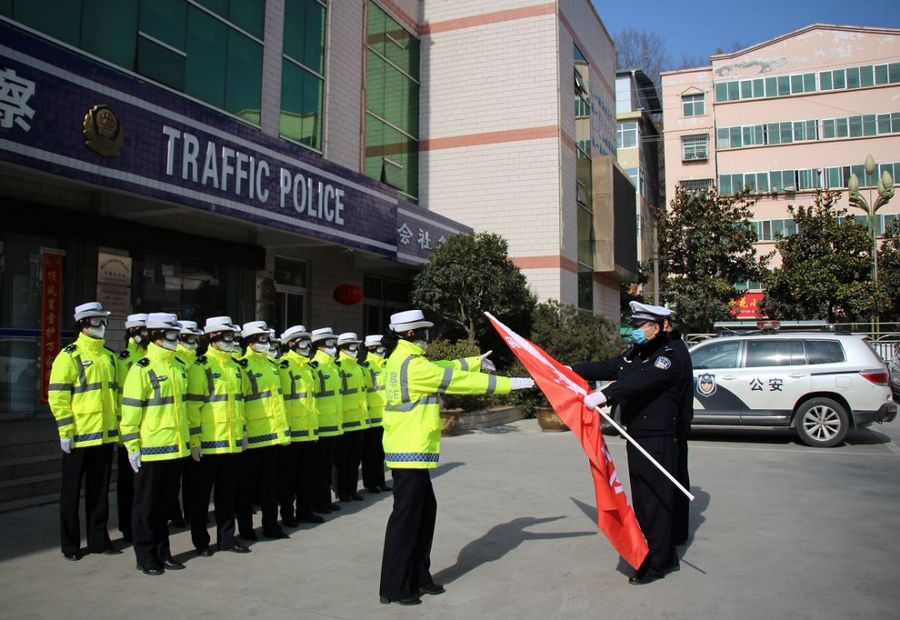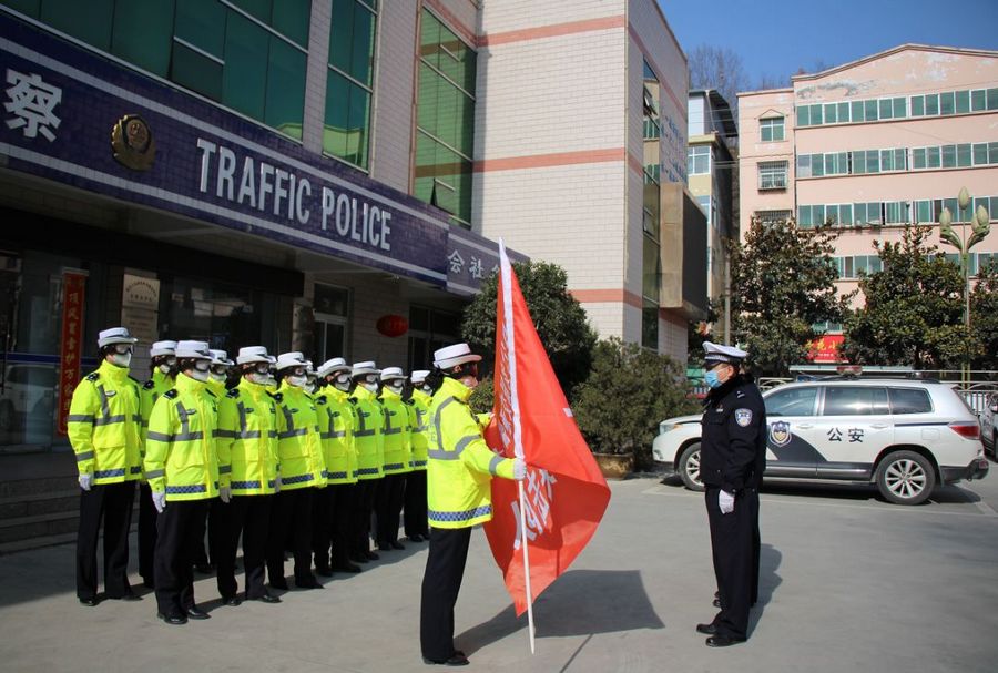 集结出发前,局党委委员、交警大队长李维宁向这批“战士”授旗,并鼓舞大家,疫情当前,全体民警、辅警要坚决响应局党委的安排部署,以实际行动彰显初心使命,坚决服从组织安排,让鲜红的党旗高高飘扬在疫情防控斗争第一线。同时,叮嘱大家坚定信心,在执勤期间做好自我防护,确保自身安全,以良好状态投身疫情防控阻击战!