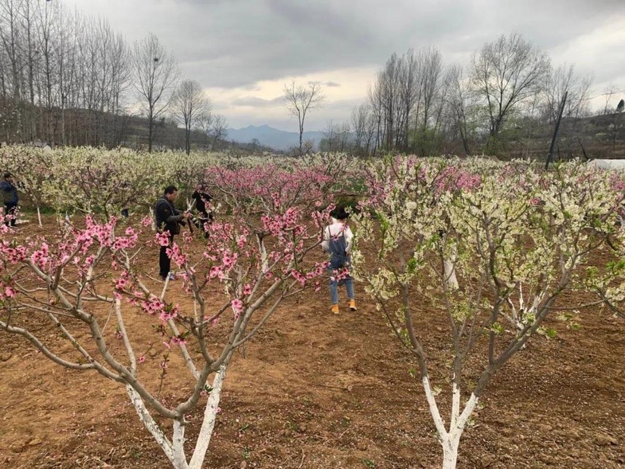 乔王艳蕊正葱茏,何不相邀共春风?走进乔王村,看到田园里盛开的果树花娇艳多姿,还有山坡上、梯田里遍野的花海漫接天际,金黄的油菜花倾泻而来,桃红十里,远山如黛,而屋舍俨然,新绿萌烟,倒别有一份微醺的意味。田间农人或荷锄背篼,或躬身抽蒜薹,或播种采薇,阡陌交通,欣荣宁静,此情,此景,如水粉画,似世外桃源,更像是上帝打翻了调色板,各种鲜艳夺目,生机勃勃,如诗如画,让人沉醉而憧憬。
