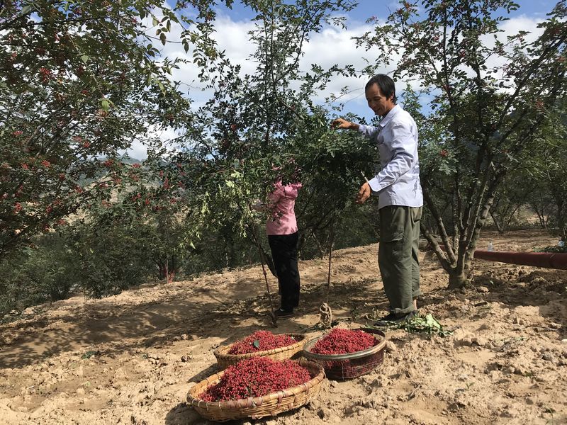 在王柏平家的椒园里,10多名工人忙着采摘红艳欲滴、颗粒饱满的花椒。“我们是碧口的,今年是来武都摘花椒的第三年了 武都的花椒很好,我一天能摘三四十斤,一天挣100多块钱。”在三河镇南山村王柏平家的椒园里,10多名工人忙着采摘红艳欲滴、颗粒饱满的花椒。