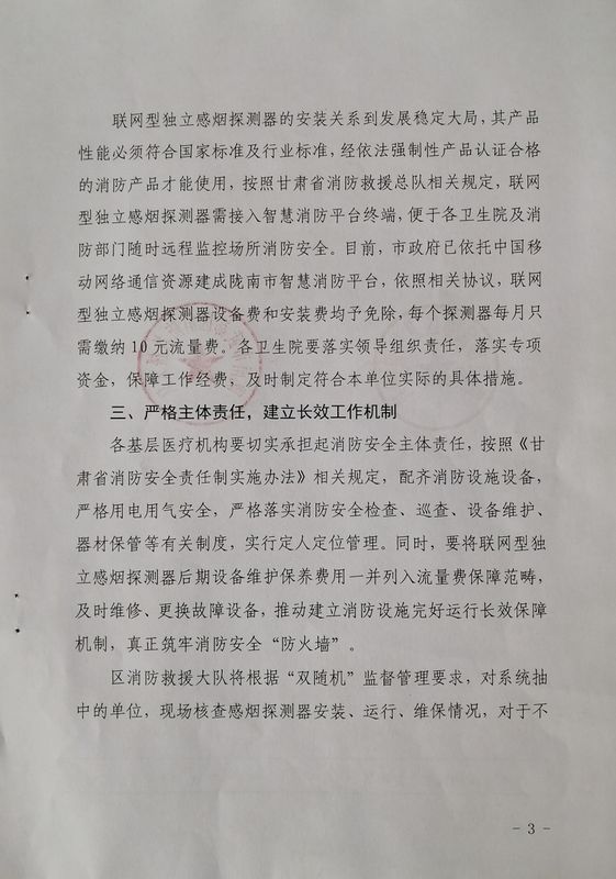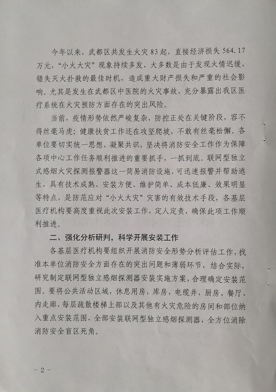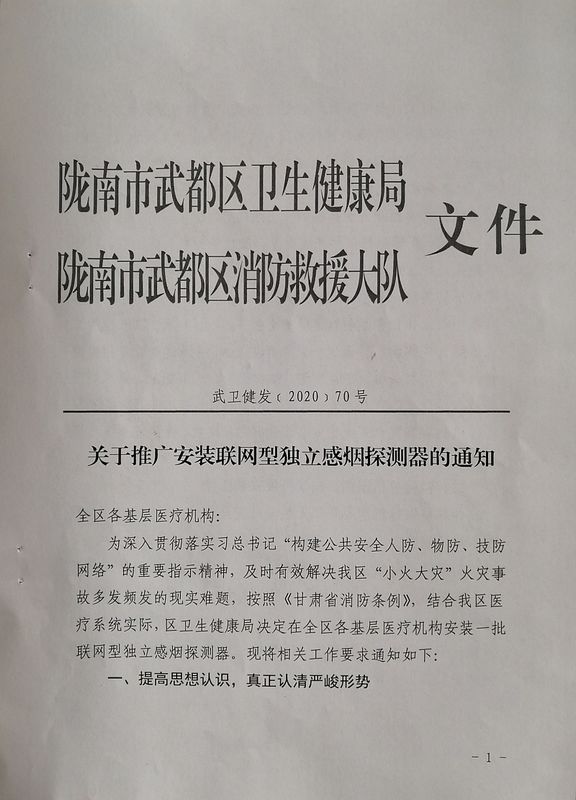 为快速高效推动全年重点工作任务落地见效,全力确保消防安全环境向好发展,陇南市武都区消防救援大队立足辖区“小火大灾”火灾事故频发的的现实难题,科学谋划,创新方式,深入辖区医疗卫生系统,推广安装联网型独立烟感探测器。