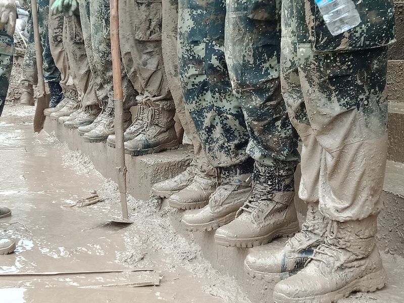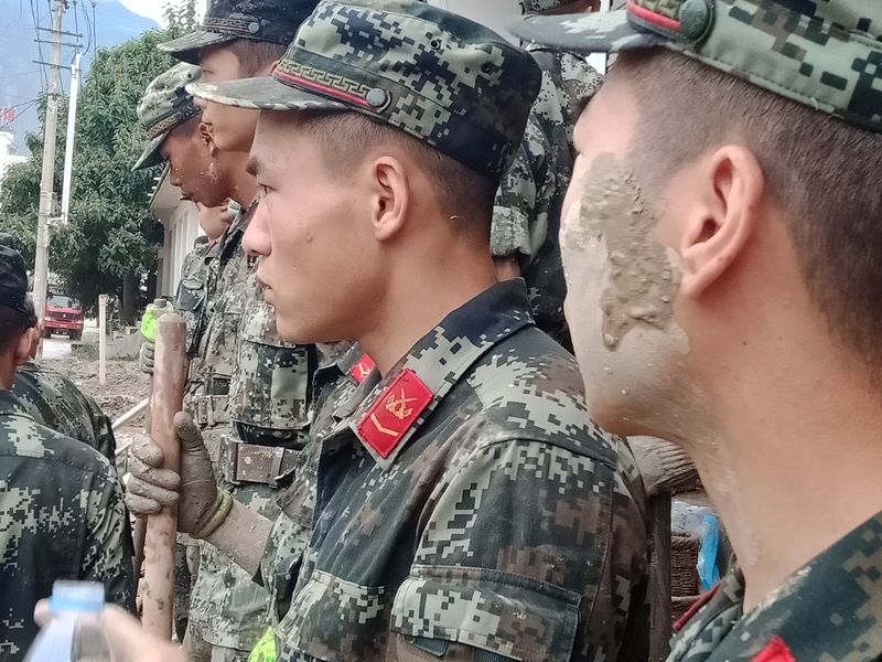 8月18号早上,两水镇大湾沟受灾现场,百余名官兵正在公路两旁一字排开,奋力清理人行道上的淤泥。道路中间的挖掘机、铲车、工程车等大型机械也在一刻不停地开展清理转运工作。