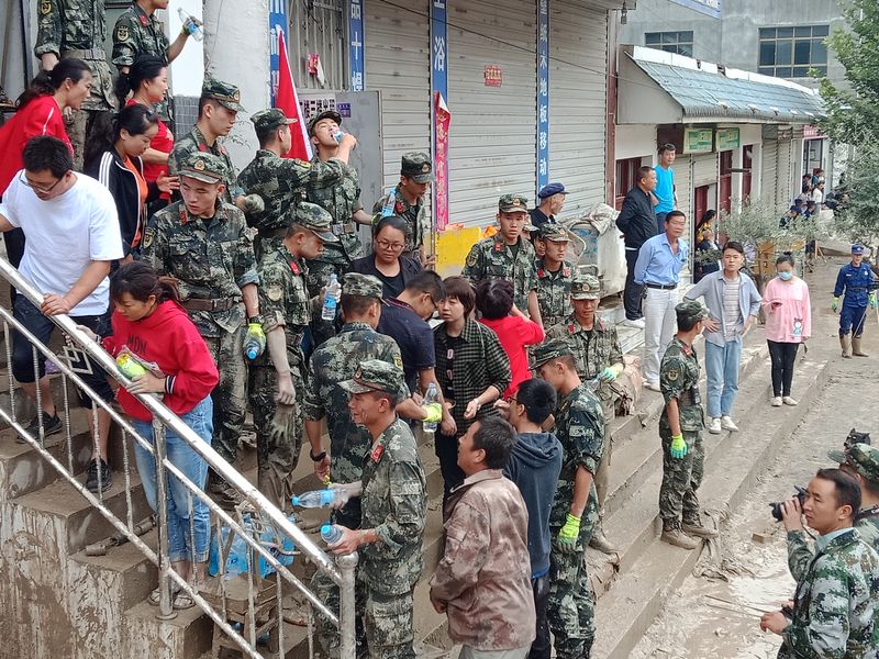 肆虐的暴洪泥石流,冲毁了美好的家园却冲不垮爱的堤坝。官兵们冲锋在前,连续奋战,让群众们备感温暖,他们自发的来到街上为官兵们送来了水和食物。