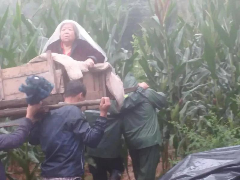 滩店村卢芝兰老人家住在上庄社庄头,腿脚不便,受接连几天暴雨的影响,卢志兰老人家门外500米道路严重滑坡,道路阻塞,无法通行,老人被困家中,滩店村党支部书记张鹏贤带领党员干部,从旁边玉米地穿过,用木板将老人抬出,由于淤泥阻塞严重,救援队每走一步都很艰难,泥巴沾满裤腿,汗水湿透衣衫,但却阻挡不住作为党员奋战一线的坚定信念。