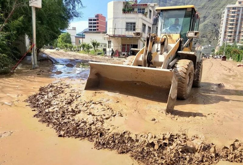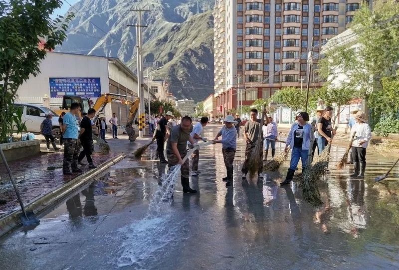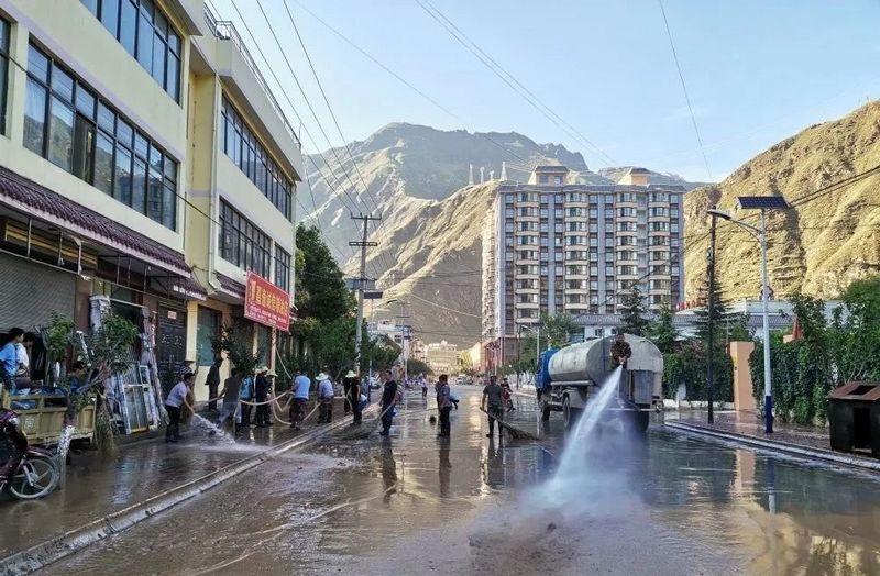 8月19日,白龙江、岷江洪峰过境,洪水逐渐消退,两河口镇区主要街道、滨河路河堤上淤积了厚厚的一层淤泥,严重影响过往车辆及群众正常生产生活。