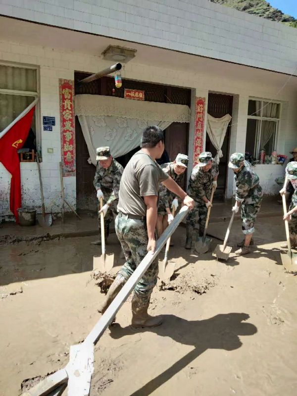 8月19日,民兵应急连再次接到命令,赴武都外纳镇抢险抗洪。连日的强降雨,致使外纳镇透防村中间河流水位上涨,从四周山上滑下的泥石灌满河道,淤泥流向周围地势低的道路和村民家中。100名应急连民兵早上10时赶到受灾地,用铁锹铲、拿木板推,齐心协力清除淤泥,至18时,为11户村民清除了家中淤泥,及时解决了淤泥满院、无法出行的问题。
