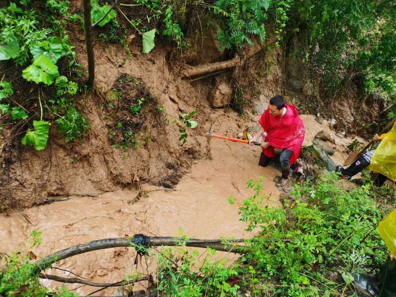 受暴雨影响,山体滑坡,黄陈镇水厂水源地至二级泵站DN125供水主管道断裂,供水中断,中湾村泥石流冲毁通往上五郎村、下五郎村的供水管道,抢修人员迅速赶赴故障现场,经勘察,发现该处地势复杂,机械设备无法入场施工,为尽快恢复供水,抢修人员第一时间赶赴现场,冒雨采取人工开挖方式施工,加班加点紧急抢修,争取尽快恢复正常供水。