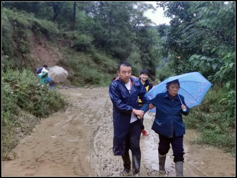 鸡峰镇树林村受灾严重,驻村帮扶工作队队长兼第一书记陈鹏同志已经54岁,灾难来临,他不怕危险、义无反顾、连续奋战,与时间赛跑,全力抢救人民群众生命财产。8月17日,听到任湾社的贫困户张菊芹等多户群众居住区域山体滑坡突发险情、出现院落地基严重下沉、房屋垮塌风险,他顾不上自己的安全,与村社干部冒雨前往救援,途中经过陡下坡路段,不慎被汹涌而下的山洪水冲出10多米,所幸奋力抓住路边树枝和石块才得以脱险,身体多处软组织挫伤。他顾不得满身疼痛,在村社干部搀扶下又迅速冲到抢险救援一线,及时安全转移群众21户。