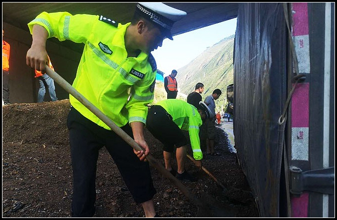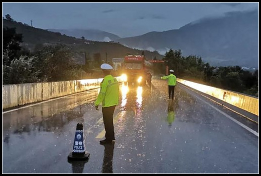 暴雨中,沙湾、两河口、南阳、临江铺部分路段出现塌方、泥石流、山体滑坡及落石险情,当地交警中队立即实行双向交通管制,为确保现场交通安全有序,民辅警顾不上大雨湿身,卷起裤腿赤脚在泥水中进行现场交通疏导并帮助遇困车辆清理淤泥脱离险境,同时加强该路段巡逻,及时发现险情,做好预警防范工作,实时通报路况信息。