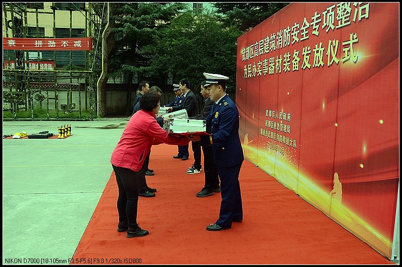 上午9时30分仪式开始,首先由武都大队副大队长雒鹏宣读器材装备分配方案;第二项与会领导向物业代表和住户发放器材装备;第三项由武都区区委常委、常务副区长张建强同志就高层建筑专项整治工作提出要求并讲话。