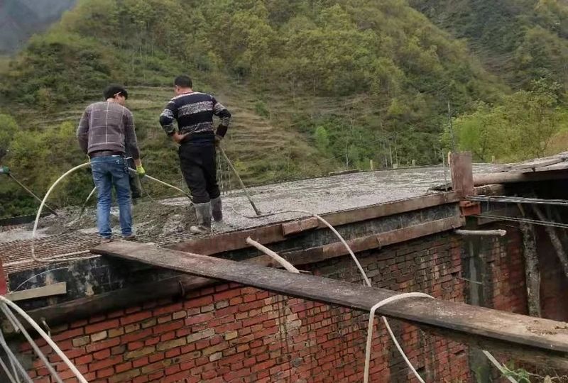 烟雨朦胧中,武都区枫相乡亚滩村杨家山社重建户杨进应和10多名乡亲正在浇筑混泥土,现代化设备商砼把混泥土直接运送到房顶,减少劳力,加快工程进度,保证工程质量。杨进应是“8.12”暴洪灾害的重灾户,家里有4口人,积极响应党委政府的号召,不等不靠不要,自己动手,即将完成房屋主体工程。