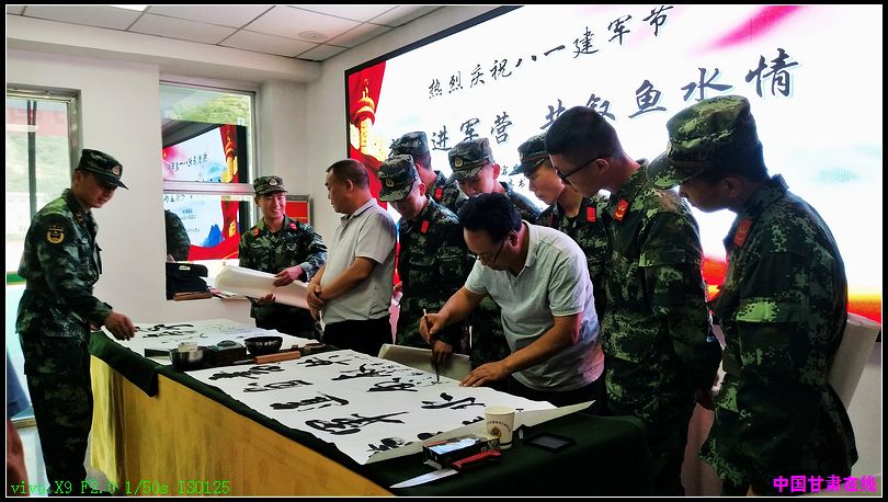 “八一”建军节即将来临之际,为了进一步丰富军营文化生活,让广大官兵近距离感受书法魅力,充分展现军民鱼水情。在武警宕昌县中队活动现场,12名书法协会的文艺志愿者即兴发挥,倾情创作,挥毫泼墨,对武警官兵的热爱和关心之情倾注于笔端,现场创作了40多幅书法作品赠送给官兵。“精忠报国”、“军民鱼水情”、“军魂”等一幅幅含墨饱满、大气磅礴、刚劲有力的书法作品一气呵成,让官兵们近距离感受了书法艺术的魅力。官兵们在翰墨佳作前驻足欣赏,细细品味,不时发出阵阵掌声。