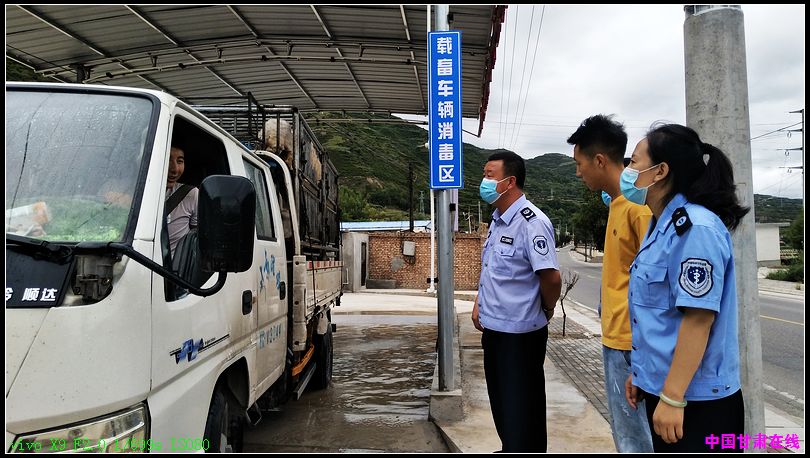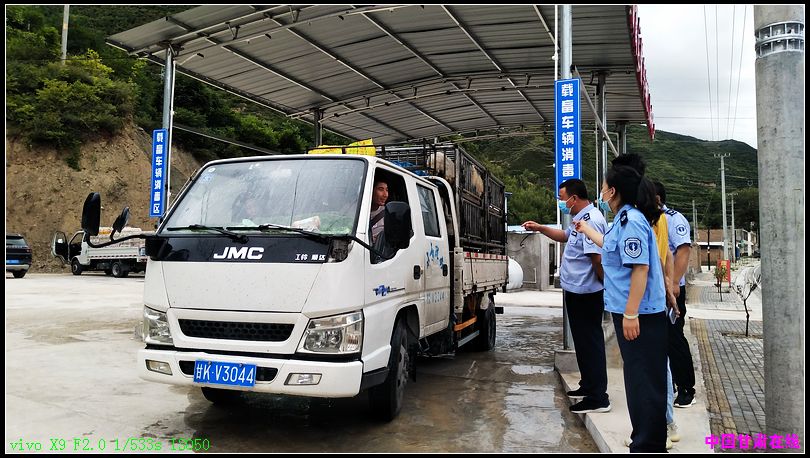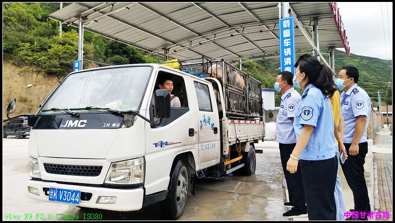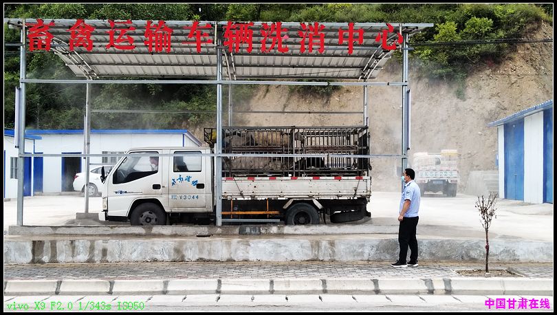 中国甘肃在线宕昌讯 停车、停车,在宕昌县何家堡村渭武高速西出口的畜禽运输车辆洗消中心,县动物卫生监督所6名执法人员忙而有序的给进城载畜禽车辆大消毒、大清洗。
