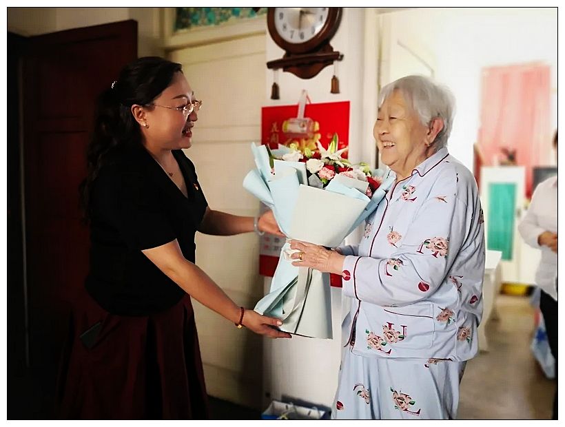 “李老师,祝您节日快乐!您潜心教书育人,为学校教育教学工作付出了毕生的心血,作为一名党龄61年的老党员,您是我们全体教师学习的榜样!”在获得“光荣在党50年”纪念章的退休老党员李菊芳家,学校党支部书记、校长张丽送上真诚的祝福和崇高的敬意。