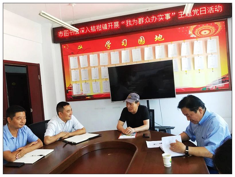 在镇政府会议室举行的主题党课上,市图书馆、桔柑镇政府党员干部就党史学习教育、驻村帮扶情况做了座谈交流。市图书馆馆长王玉昆指出,这次赴桔柑镇开展“我为群众办实事”主题党日活动,给基层单位送图书、送书画,就是把上级部门的安排部署落到实处,发挥图书馆自身特色优势,创新学习方法,开展具有图书馆特点的党史学习教育活动,用实际行动践行学党史、悟思想、办实事、开新局。
