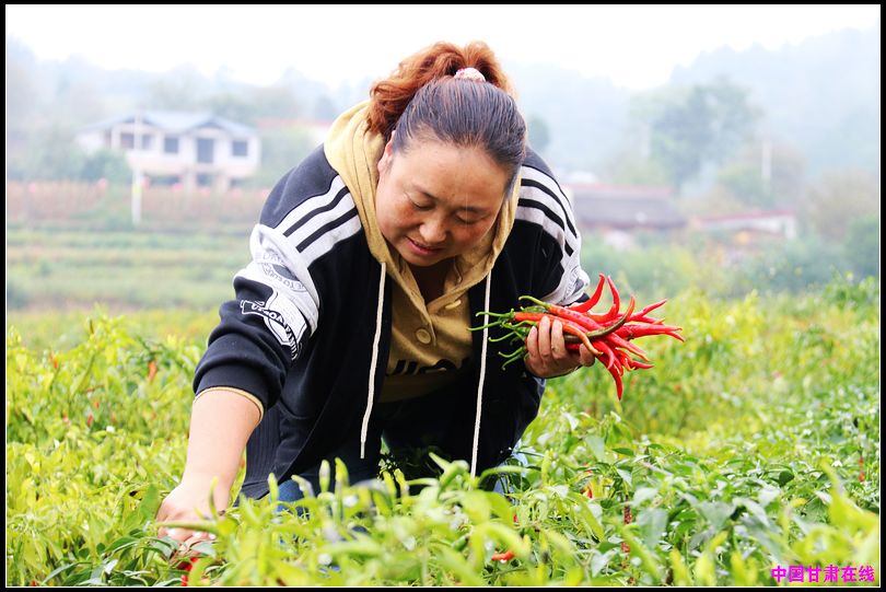 中国甘肃在线成县讯 走进城关镇高旗村,道路两旁的田地里,成片成片红红的辣子在绿叶的映衬下显得格外醒目。农民们边忙着采摘边有说有笑,相互诉说着丰收的喜悦。