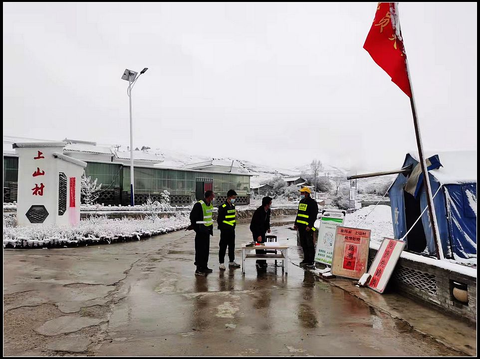 11月25日,礼县境内普遍降雨,而位于礼县西南边的草坪乡,因为高寒阴湿的地理环境,境内各村已是飞雪连天。草坪乡因为宕昌县、武都区接壤,承担着礼县西南端口疫情防控检测任务,所以疫情防控工作异常严峻。为了全面完成疫情防控任务,该乡各村检测点上的党员干部、志愿者,顶着已趋近零下的严寒,在白雪皑皑下,坚守着礼县的西南角。
